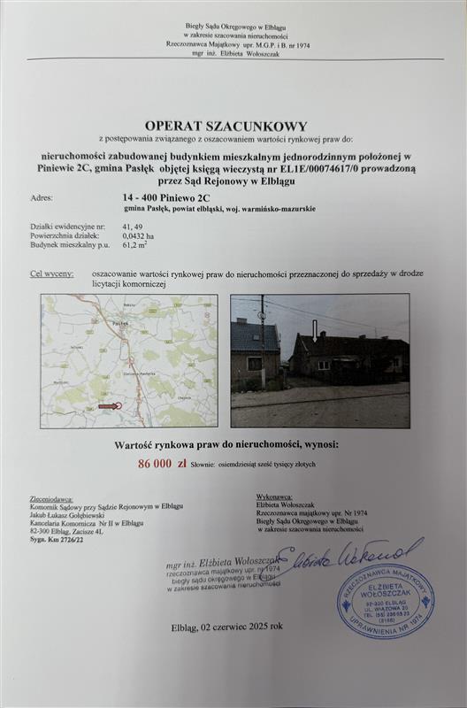 - nieruchomości położonej przy Piniewo 2C, 14-400 Pasłęk, dla której Sąd Rejonowy w Elblągu VI Wydział Ksiąg Wieczystych (adres: ul. Płk. Dąbka 21, Elbląg, 82-300 Elbląg) prowadzi księgę wieczystą o numerze EL1E/00074617/0.