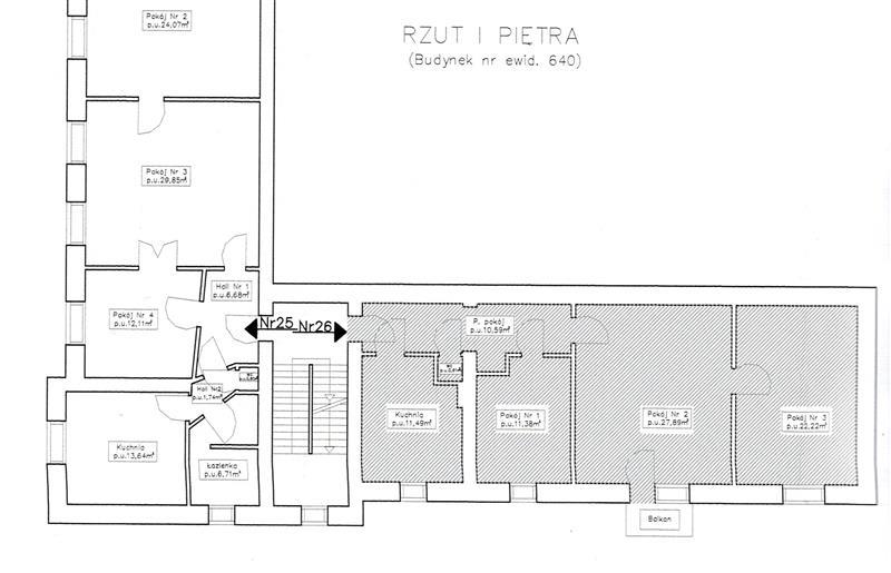 lokal mieszkalny nr 26 o powierzchni użytkowej 84,18 m2, usytuowany na I piętrze, składający się z przedpokoju, wc, kuchni, pokoju nr 1, pokoju nr 2, pokoju nr 3, oraz piwnicy nr 26 o powierzchni użytkowej 9,72 m2, wraz z udziałem 9390/232482 prawa własności działki ozn. nr 147, wartość pozostałych części wspólnych budynków w udziale 9390/232482,