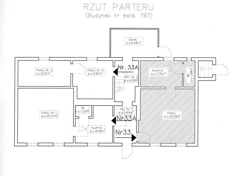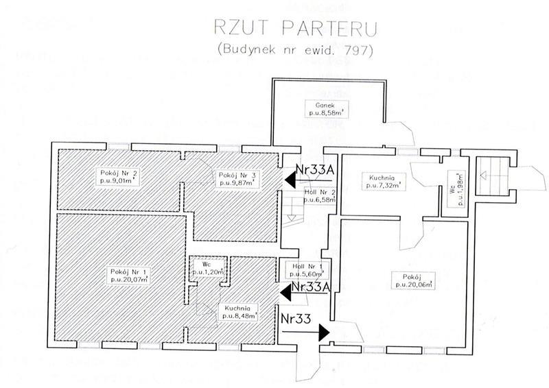 lokal mieszkalny nr 33 o powierzchni użytkowej 29,36 m2, usytuowany w budynku drewnianym wolnostojącym na parterze, składający się pokoju, kuchni, wc oraz piwnicy nr 33 o powierzchni użytkowej 4,80 m2, wraz z udziałem 3416/232482 prawa własności działki ozn. nr 147, wartość pozostałych części wspólnych budynków w udziale 3416/232482,