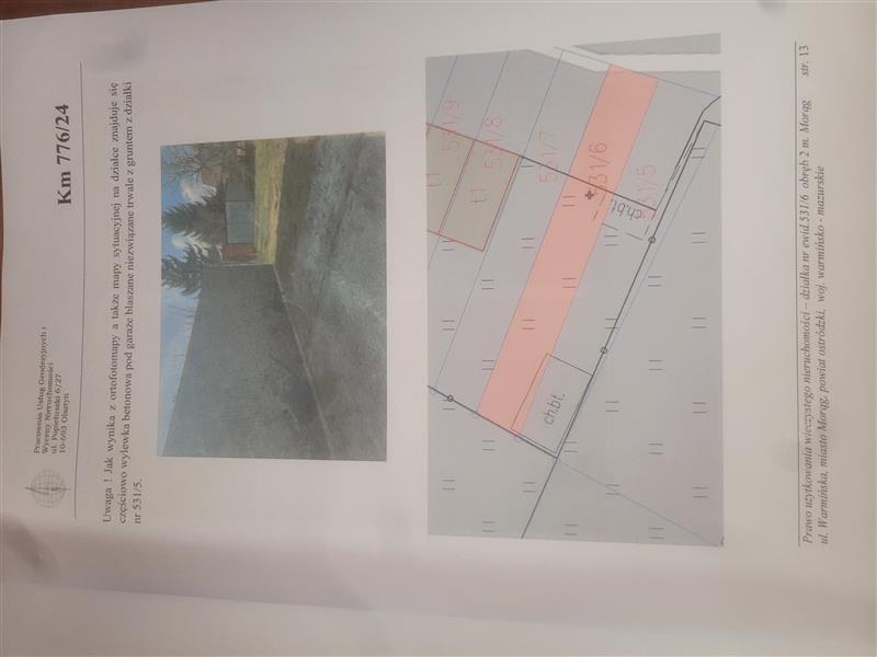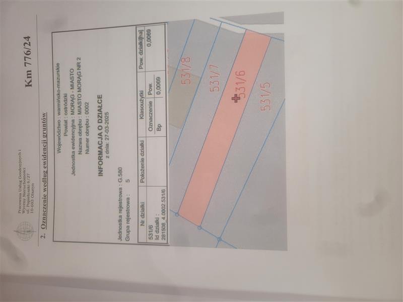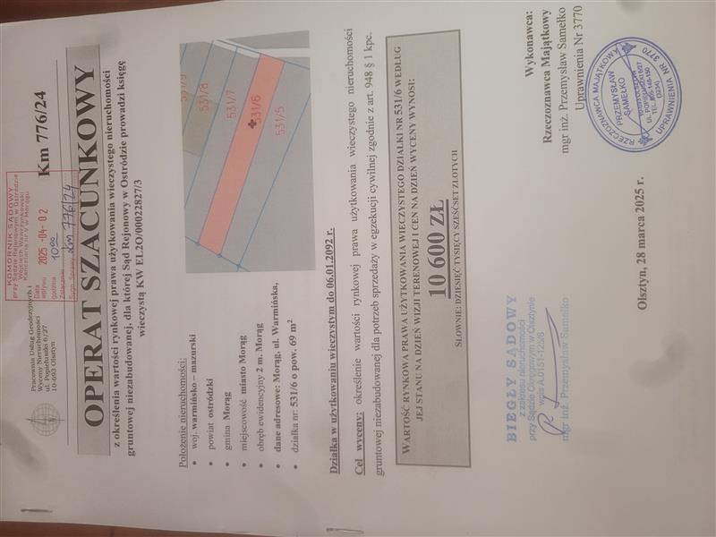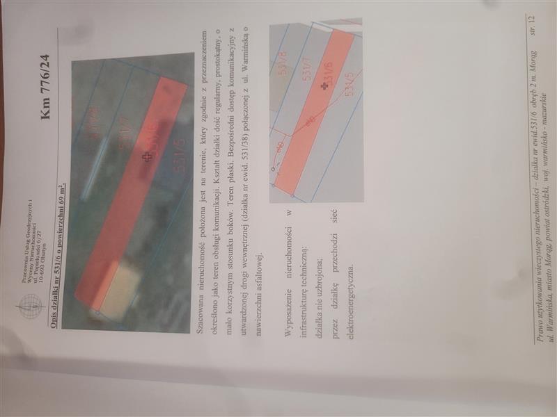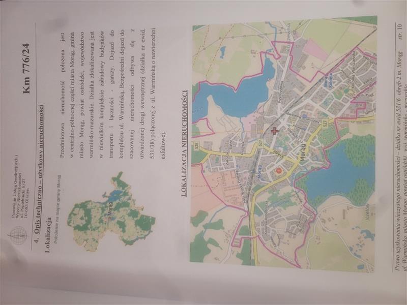 Przedmiotem licytacji jest prawo wieczystego użytkowania nieruchomości stanowiącej działkę ewidencyjną nr 531/6 o powierzchni 69 m kw (0,0069 ha) obręb 2 m. Morąg, położoną przy ul. Warmińskiej w Morągu (powiat ostródzki, woj. warmińsko-mazurskie) - data końcowa użytkowania 06.01.2092. Nieruchomość położona jest na terenie, który zgodnie z przeznaczeniem określono jako teren obsługi komunikacji. Kształt działki dość regularny, prostokątny, o mało korzystnym stosunku boków. Teren plaski. Bezpośredni dostęp komunikacyjny z utwardzonej drogi wewnętrznej (działka nr ewid. 531/38) połączonej z ul. Warmińską o nawierzchni asfaltowej. Wyposażenie nieruchomości w infrastrukturę techniczną: działka nie uzbrojona; przez działkę przechodzi sieć elektroenergetyczna. Jak wynika z ortofotomapy, a także mapy sytuacyjnej na działce znajduje się częściowo wylewka betonowa pod garaże blaszane niezwiązane trwale z gruntem z działki nr 531/5. Ponadto z mapy wynika, że garaże z działki nr 531/5 zachodzą na