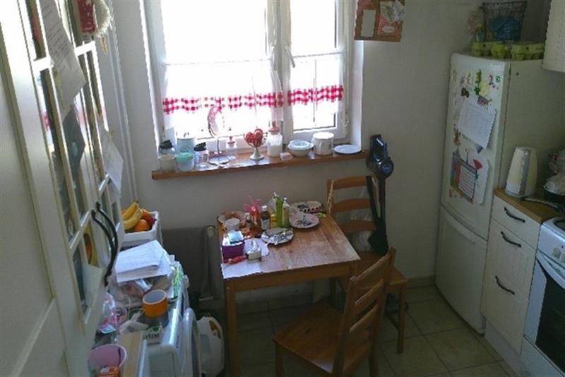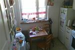 Meble modułowe, kuchenka gazowa z piekarnikiem Indesit, lodówka wolnostojąca, zlewozmywak jednokomorowy, okno PCV z 2008 r., parapet drewniany, grzejnik stalowy, wentylacja grawitacyjna