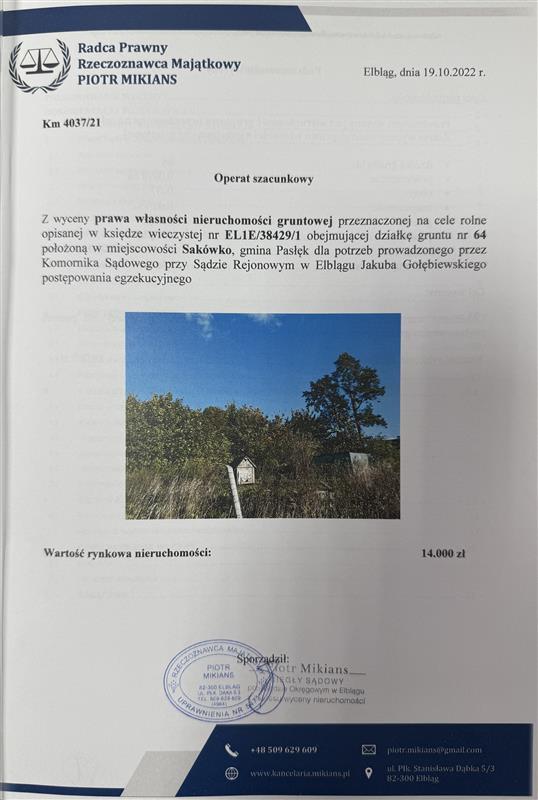 - nieruchomości położonej przy .dz. nr 64,Sakówko, 14-400 Pasłęk, dla której Sąd Rejonowy w Elblągu VI Wydział Ksiąg Wieczystych (adres: ul. Płk. Dąbka 21, Elbląg, 82-300 Elbląg) prowadzi księgę wieczystą o numerze EL1E/00038429/1.