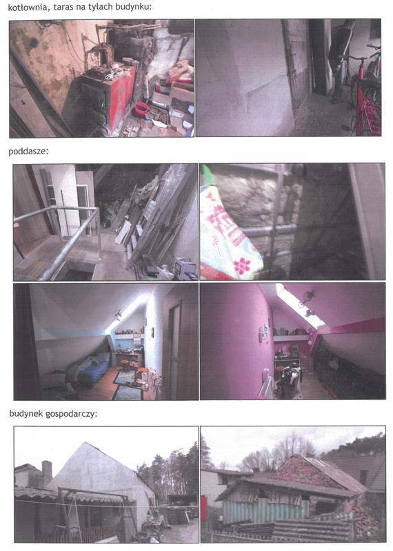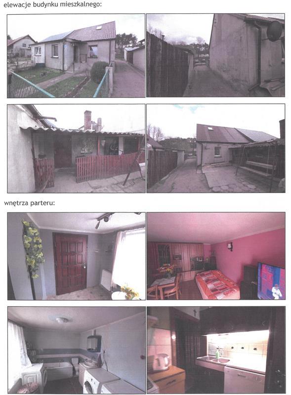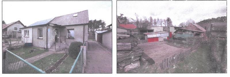 Usytuowany na nieruchomości budynek mieszkalny to obiekt w zabudowie bliźniaczej, przylegający do podobnego segmentu na działce sąsiadującej po stronie południowej, parterowy z częściowo użytkowym poddaszem i dwuspadowym dachem, wzniesiony w połowie XX w. w konstrukcji tradycyjnej murowanej. Budynek o prostej bryle, na rzucie prostokąta, z parterową dobudówką z płaskim dachem od strony wschodniej mieszczącą wiatrołap oraz parterową dobudówką z płaskim dachem, w której znajduje się jeden pokój i kotłownia. Fundamenty betonowe, ściany murowane z elementów drobnowymiarowych, dach dwuspadowy konstrukcji drewnianej, kryty blachodachówką i częściowo ocieplony wełną mineralną. Ściany działowe parteru murowane, na poddaszu z płyt gipsowo-kartonowych na ruszcie stalowym. Schody wewnętrzne drewniane składane. Komin z cegły ceramicznej pełnej. Tynki cementowo-wapienne. Wyposażenie w instalację wodno-kanalizacyjną, elektroenergetyczną, c.o. (piec na paliwo stałe usytuowany w kotłowni, grzejniki płytowe).