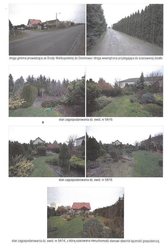 Działka ewidencyjna nr 54/16 o powierzchni 222 m2. Nieruchomość ma kształt prostokąta o szerokości ok. 9m, położonego prostopadle do wewnętrznej drogi dojazdowej. Działka ma płaskie ukształtowanie jest niezabudowana, stanowi część ogrodu przydomowego tworząc łączność gospodarczą z przyległą do niej od strony zachodniej działką ewidencyjną nr 54/14 (o powierzchni 1361m2). Jest wspólnie z nią ogrodzona (parkan z siatki stalowej na stalowych słupkach), bardzo estetycznie zagospodarowana i porośnięta licznymi krzewami ozdobnymi. Wzdłuż ogrodzenia posadzono gęsty szpaler około trzymetrowych żywotników. W przyległej do nieruchomości drodze wewnętrznej przebiega sieć wodociągowa, elektroenergetyczna i telekomunikacyjna. Sąsiednie, zabudowane budynkami mieszkalnymi nieruchomości wyposażone są w przyłącza tych sieci. Nieruchomość NIE POSIADA dostępu do drogi publicznej.