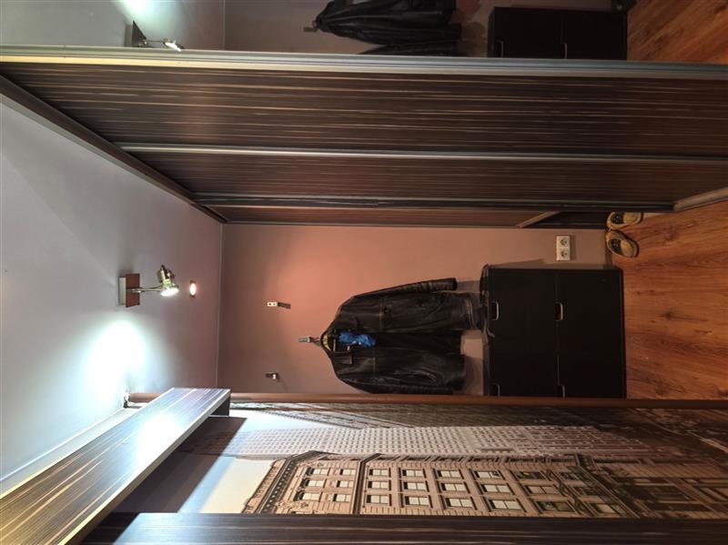 Ściany: ściany w przedpokoju pokryte gładzią gipsową i pomalowane farbą oraz fototapetą. Na jednej ze ścian położono płytki imitujące naturalny kamień. Dodatkowo na jednej ze ścian zabudowano dużą szafę z drzwiami przesuwnymi. W łazience z wc ściany na całej wysokości obłożone płytkami ceramicznymi. W łazience z wc brak umywalki, armatura sanitarna zużyta. W pokoju ściany pokryte gładzią gipsową i pomalowane farbą, na jednej ze ścian położono fototapetę. W kuchni ściany pokryte gładzią gipsową i pomalowane farbą, na ścianie nad blatem kuchennym położono fartuch z płytek ceramicznych. Meble kuchenne w stałej zabudowie, na wymiar.