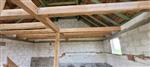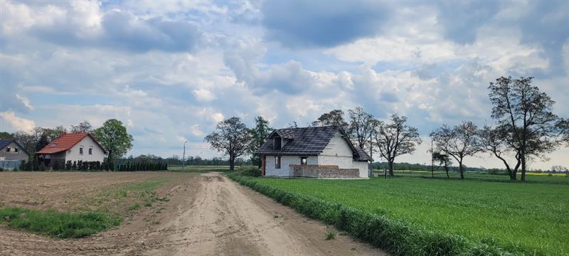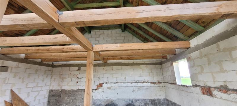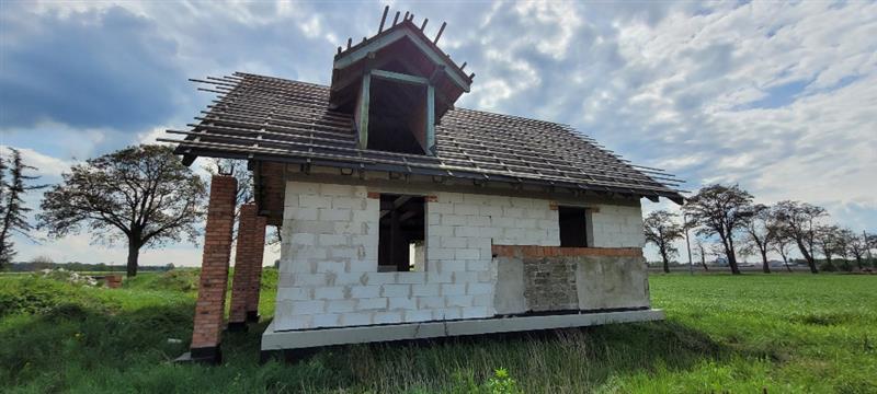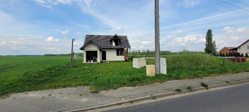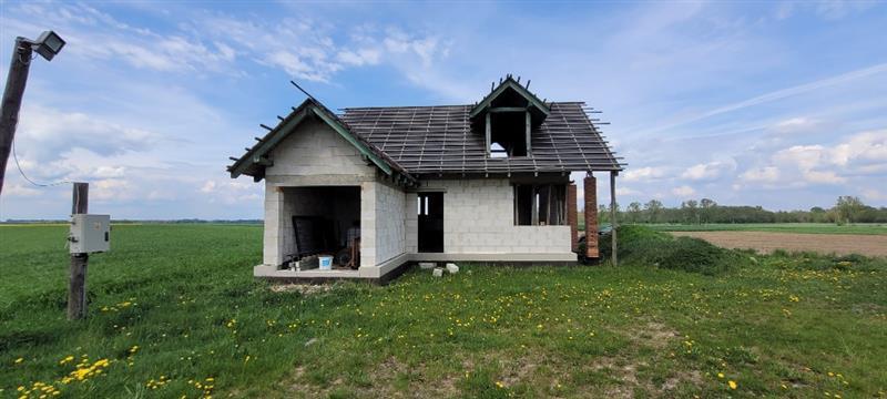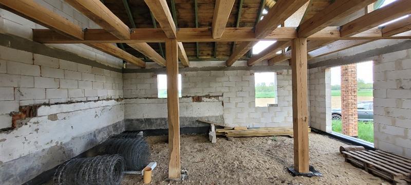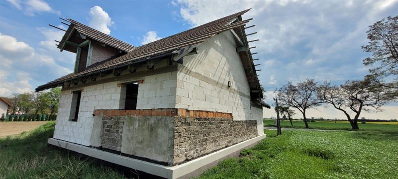 Budynek mieszkalny z częścią handlowo-usługową: pustostan - w trakcie budowy. Budynek parterowy z poddaszem użytkowym, niepodpiwniczony, w zabudowie wolnostojącej, budowany w latach 2019-2025 w technologii tradycyjnej murowanej o powierzchni użytkowej 157,02 m2. Fundamenty żelbetowe, ściany zewnętrzne i wewnętrzne z silki, bez ocieplenia i otynkowania, dach o konstrukcji drewnianej pokryty papą na deskowaniu. Brak instalacji w budynku.