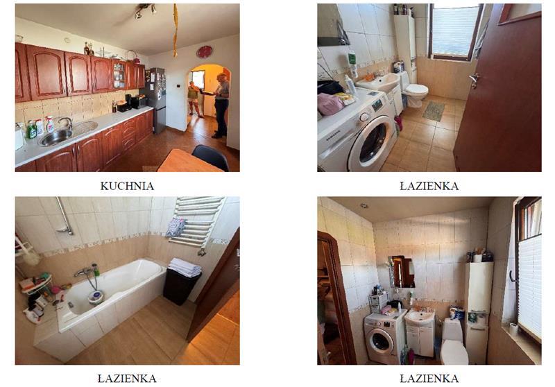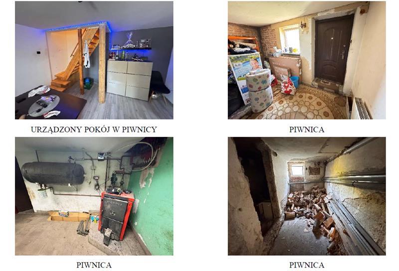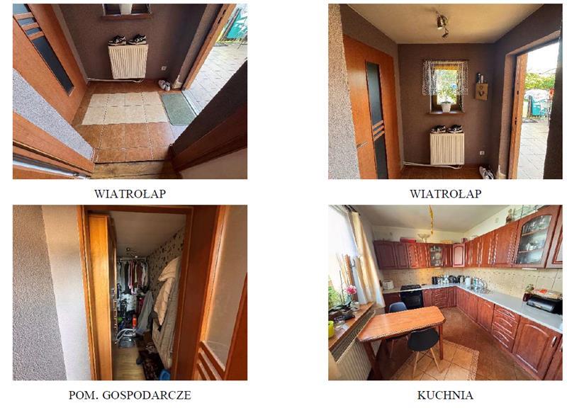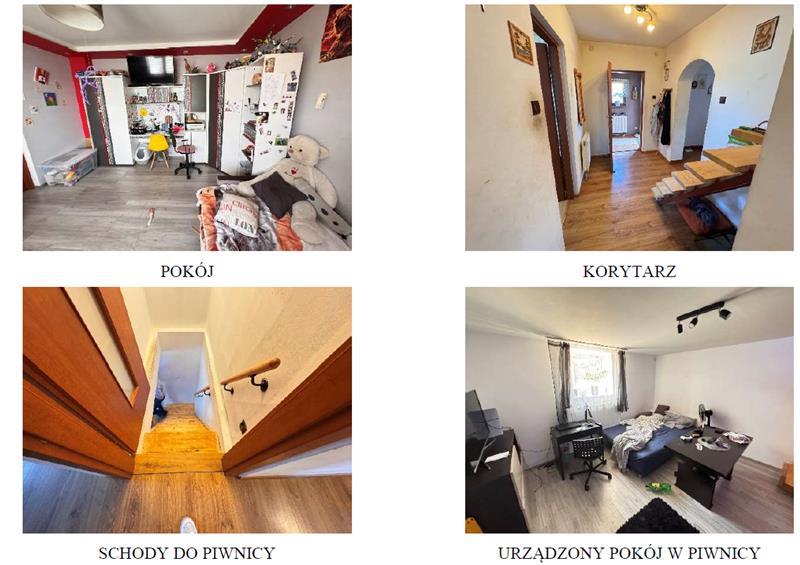 z przeszkleniami. W pokojach na parterze i w przedpokoju na podłodze panele, ściany i sufity malowane. Pokój dzienny stanowi pomieszczenie przechodnie. W łazience na podłodze i na ścianach płytki, sufit podwieszany. W wiatrołapie ma podłodze płytki, ściany i sufit malowane. W kuchni na podłodze płytki, ściany malowane, częściowo wyłożone płytkami, sufit malowany. W garderobie na podłodze panele, ściany wyłożone tapetą. Wyposażenie łazienki stanowi: wanna, umywalka na szafce, wc. W kuchni zabudowa meblowa ze sprzętem AGD. W części piwnicznej urządzony został dodatkowy pokój. Zejście z parteru stromymi schodami drewnianymi. W niniejszym pokoju na podłodze jasne panele, ściany i sufit pokryte powłokami malarskimi. W budynku rozprowadzone instalacje: wodno – kanalizacyjna (sieć gminna), elektryczna, c.o. (na paliwo stałe; kocioł nadający się do wymiany); w kuchni i w łazience ogrzewanie podłogowego, c.w.u. (terma). W większości pomieszczeń w parterze grzejniki panelowe, w łazience grzejnik drabinkowy. W piwnicy zamontowane dwa grzejniki panelowe. Dodatkowo wykonany przyłącz gazowy. Wykonane przyłącze gazowe w budynku, wraz z odbiorem. Na dzień oględzin brak pieca gazowego. Budynek w zadowalającym stanie technicznym. Poddasze nieurządzone.