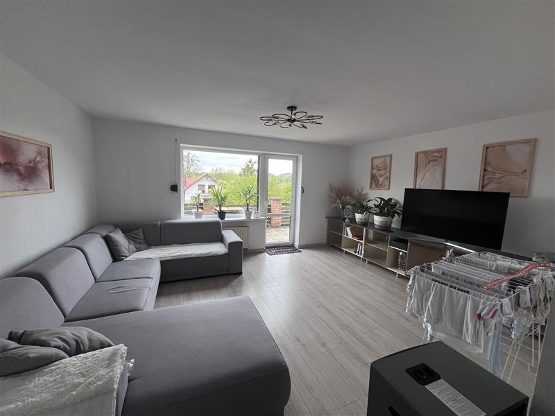 - na niższym poziomie znajduje się kuchnia, korytarz, cztery pokoje, łazienka, wc,