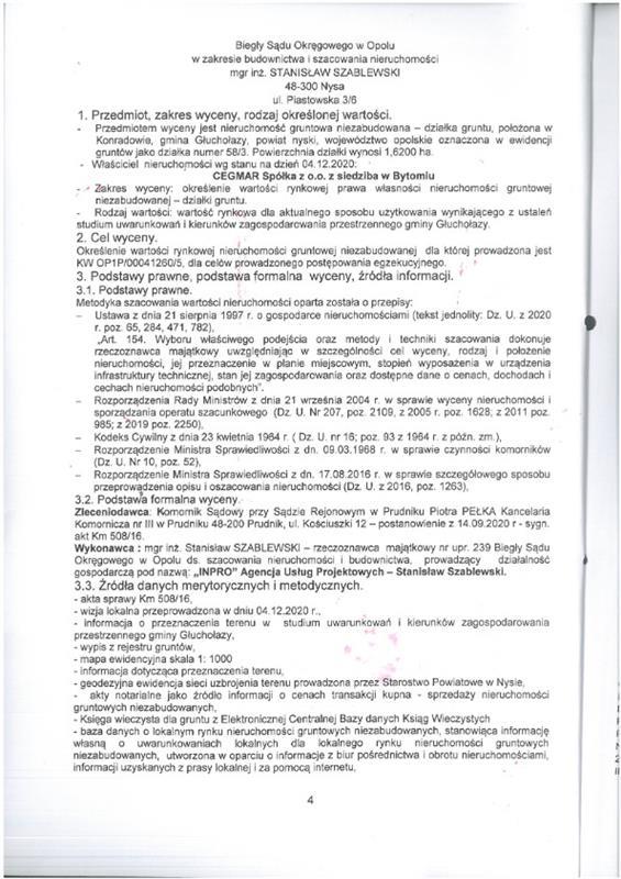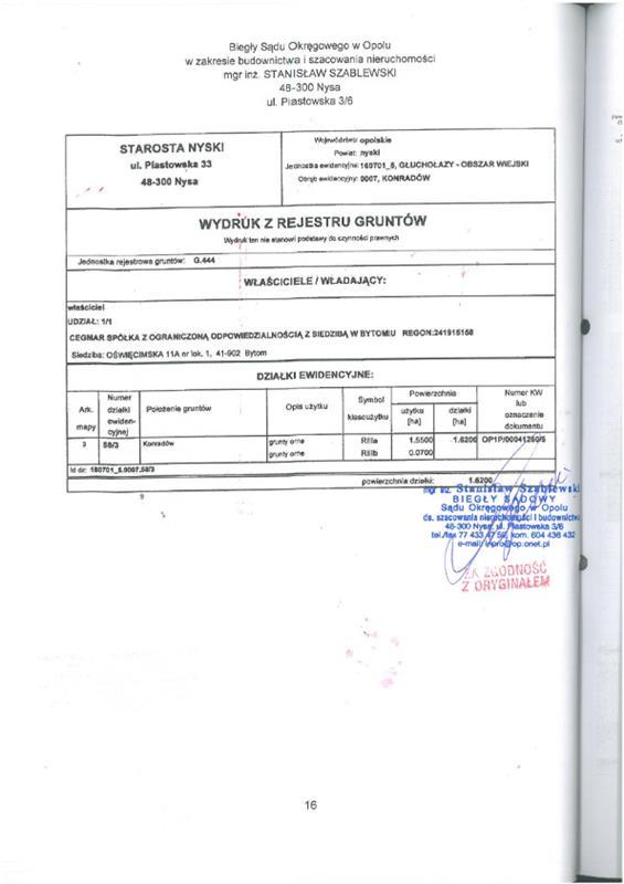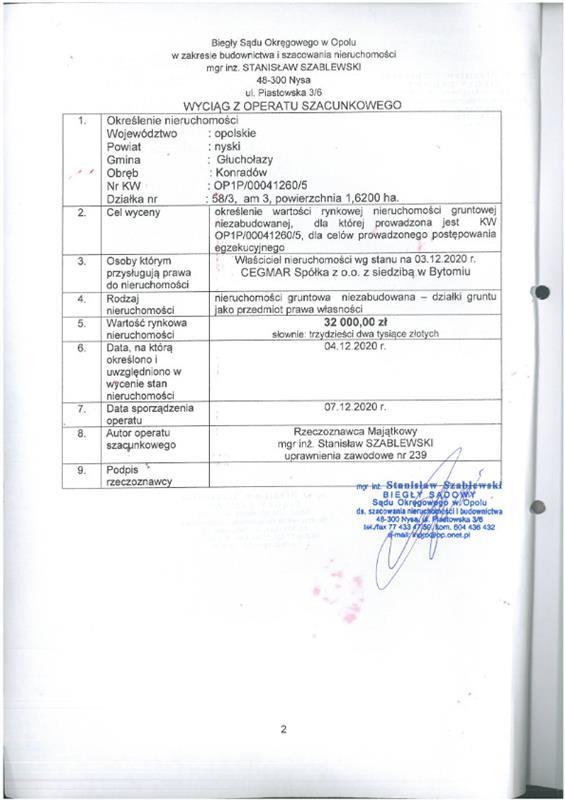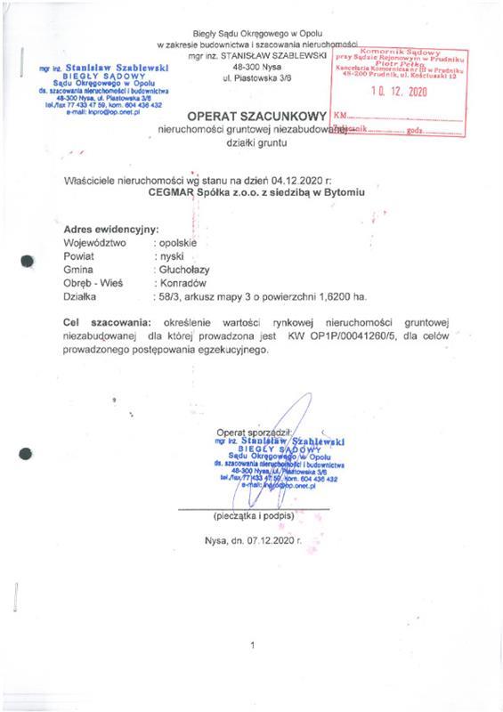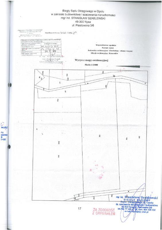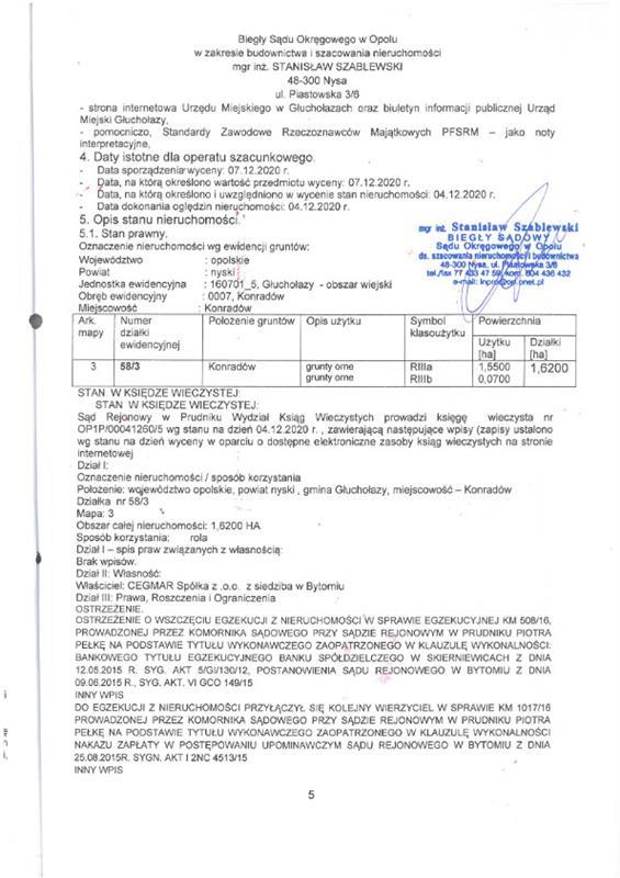 - nieruchomości położonej przy b/d,Konradów, 48-340 Głuchołazy, dla której Sąd Rejonowy w Prudniku V Wydział Ksiąg Wieczystych (adres: ul. Kościuszki 5, Prudnik, 48-200 Prudnik) prowadzi księgę wieczystą o numerze OP1P/00041260/5.