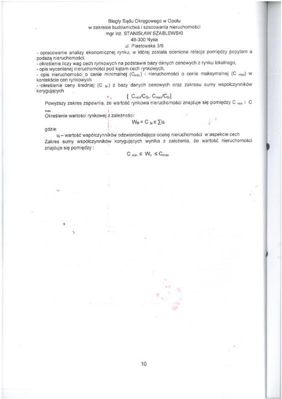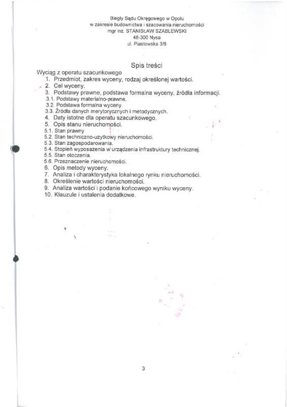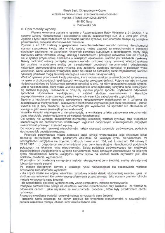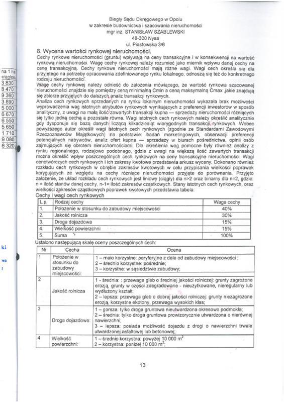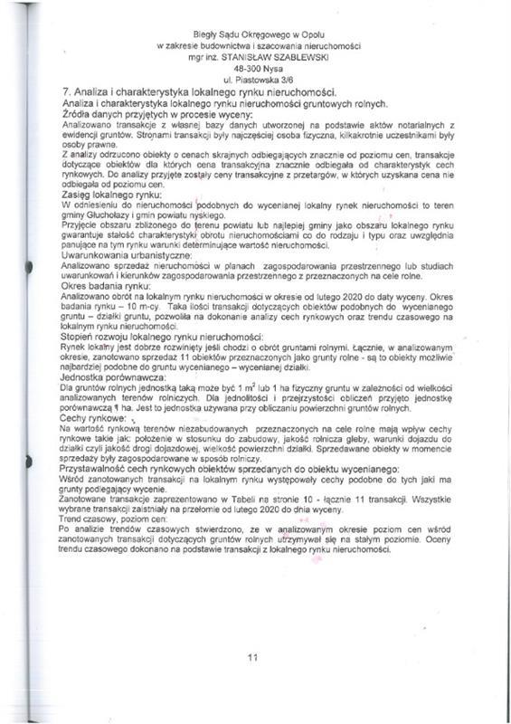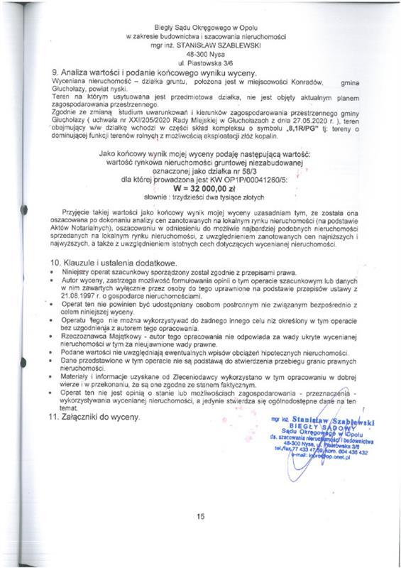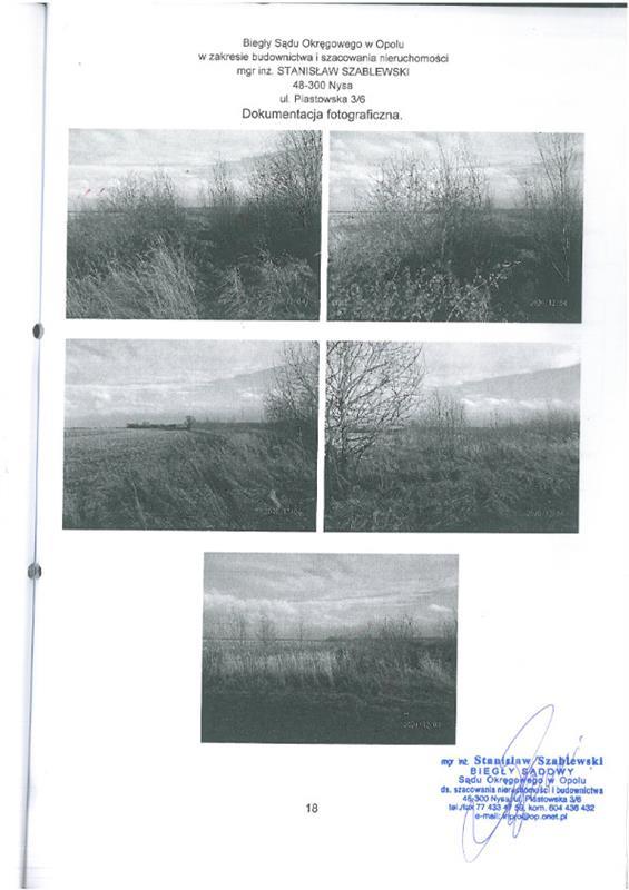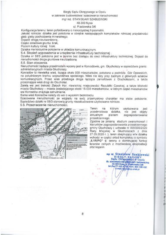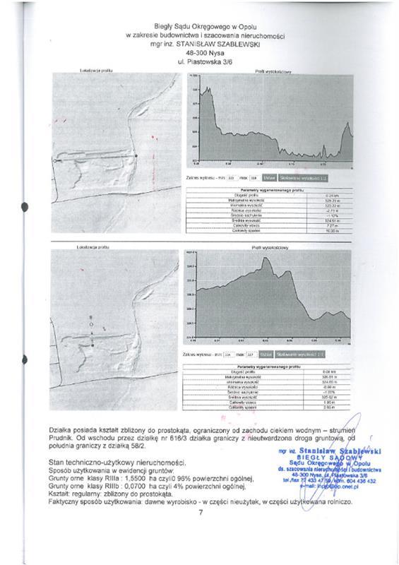 nieruchomość gruntowa niezabudowana działka nr 58/3 (rola) pow. 1,6200ha. Działka w ewidencji gruntów stanowiąca rolę, służyła do pozyskiwania surowców mineralnych - dawne wyrobisko gliny. Dawne wyrobisko zajmuje północną część działki na całej jej długości i szerokości ok. 50m. Ta część działki charakteryzuje się niekorzystną hipsometrią gruntu. Działka posiada kształt zbliżony do prostokąta, ograniczony od zachodu ciekiem wodnym - strumień Prudnik. Od wschodu przez działkę nr 616/3 działka graniczy z nieutwardzoną drogą gruntową, od południa graniczy z działką nr 58/2. Grunty orne klasy RIIIa: 1,5500ha czyli 96% pow. ogólnej, grunty orne klasy RIIIb: 0,0700ha czyli 4% pow. ogólnej. Faktyczny sposób użytkowania: dawne wyrobisko - w części nieużytek, w części użytkowana rolniczo.
