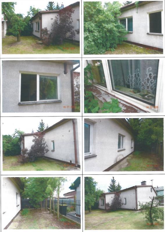 Stan techniczny budynku – Budynek znajduje się w złym stanie technicznym, wymagającym pilnych prac remontowych lub modernizacyjnych w zakresie konstrukcji dachowej, elewacji, stolarki drzwiowej i bramowej. Elewacja budynku jest pokryta tynkiem typu „baranek”, który wykazuje zabrudzenia, przebarwienia oraz możliwe zawilgocenia przy strefie przyziemia, co może świadczyć o niesprawnej izolacji fundamentów. Konstrukcja dachu nosi ślady zużycia. Bramy garażowe wykonane z drewna i są w wyraźnie złym stanie – powierzchnia drewna jest silnie spękana, miejscami odspojona, z widocznymi śladami butwienia i odbarwień.