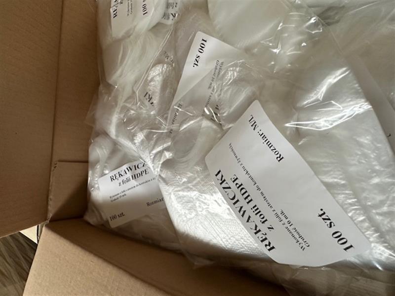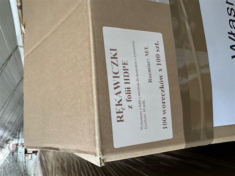 | 1 | Rękawiczki z Folii HDPE(atest do kontaktu z żywnością) Grubość 10 mik. rozm. M/L Cena oszacowania 200,00zł brutto dotyczy jednego kartonu rękawiczek ( tj. 100 opakowań po 100 sztuk ) | 124 | 200,00 zł 162,60 zł netto + 23% VAT | 150,00 zł* | 8,00 zł | Józefów, ul. Szkolna, 63, 05-119, Józefów. W dniu 29.01.2026 w godzinach od 11:15 do 11:30 |