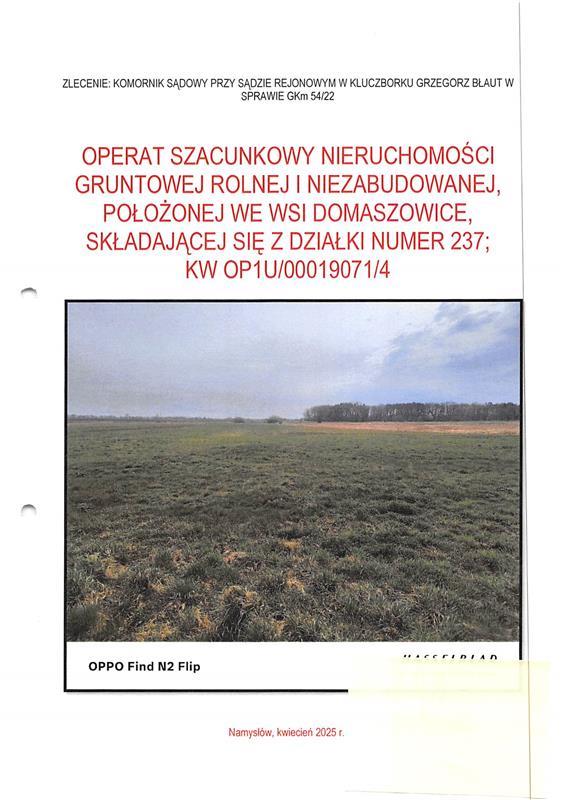 - nieruchomości położonej przy dz. 237, 46-146 Domaszowice, dla której Sąd Rejonowy w Kluczborku Wydział Ksiąg Wieczystych (adres: ul. ul, M. Skłodowskiej-Curie 15, Kluczbork, 46-200 Kluczbork) prowadzi księgę wieczystą o numerze OP1U/00019071/4.