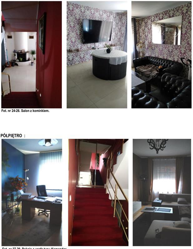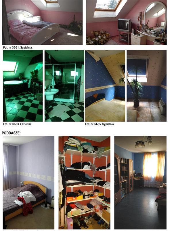 Przedmiotowy budynek mieszkalny składa się z części piwnicy, gdzie został urządzony basen, pomieszczenie filtracyjne, pomieszczenie gospodarcze i pralnia. Na parterze znajduje się dwustanowiskowy garaż, WC i pokój z wyjściem na ogród. Na podwyższonym parterze mieści się hol wejściowy, aneks kuchenny oraz salon z kominkiem i klimatyzacją. Z salonu prowadzi wyjście na taras o pow. 14,87 m2. Na półpiętrze znajduje się szafa typu Komandor oraz dwa pokoje. Piętro składa się z łazienki (wanna, brodzik, WC) i dwóch pokoi. Poddasze zajmuje garderoba i dwa pokoje. Całość powierzchni na podstawie KW łącznie stanowi 256,96 m2. Dodatkowo pod tarasem znajduje się pomieszczenie gospodarcze o pow. 11,87m2 z wejściem od ogrodu.
