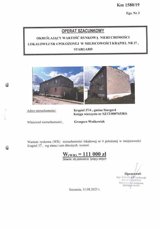 - lokalu mieszkalnego położonego przy Krąpiel 37/4, 73-131 Krąpiel, dla którego Sąd Rejonowym w Stargardzie V Wydział Ksiąg Wieczystych (adres: ul. Ul. Wojska Polskiego 17, Stargard, 73-110 Stargard) prowadzi księgę wieczystą o numerze SZ1T/00076538/6.