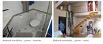 Wyposażenie łazienek: wanna półokrągła, obudowana, kabiny natryskowe, umywalki na blatach murowanych, muszle ceramiczne stojące i podwieszane na stelażu.