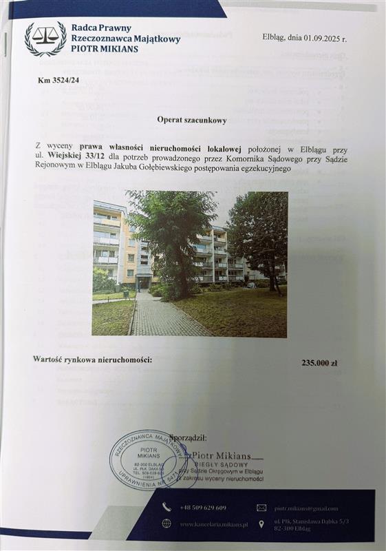 - lokalu mieszkalnego położonego przy Wiejska 33/12, 82-300 Elbląg, dla którego Sąd Rejonowy w Elblągu VI Wydział Ksiąg Wieczystych (adres: ul. Płk. Dąbka 21, Elbląg, 82-300 Elbląg) prowadzi księgę wieczystą o numerze EL1E/00086418/2.