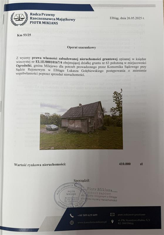 - nieruchomości położonej przy Ogrodniki 37, 82-316 Milejewo, dla której Sąd Rejonowy w Elblągu VI Wydział Ksiąg Wieczystych (adres: ul. Płk. Dąbka 21, Elbląg, 82-300 Elbląg) prowadzi księgę wieczystą o numerze EL1E/00010167/4.