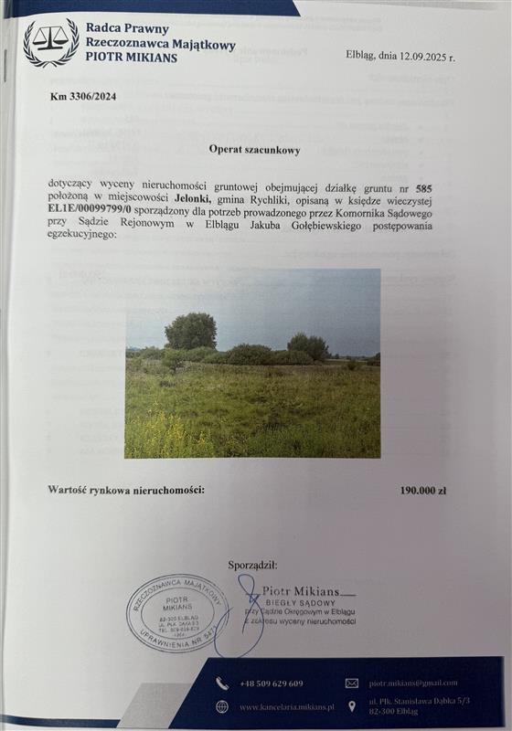 - nieruchomości położonej przy Jelonki 585, 14-411 Rychliki, dla której Sąd Rejonowy w Elblągu VI Wydział Ksiąg Wieczystych (adres: ul. Płk. Dąbka 21, Elbląg, 82-300 Elbląg) prowadzi księgę wieczystą o numerze EL1E/00099799/0.