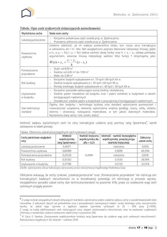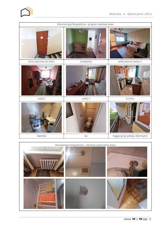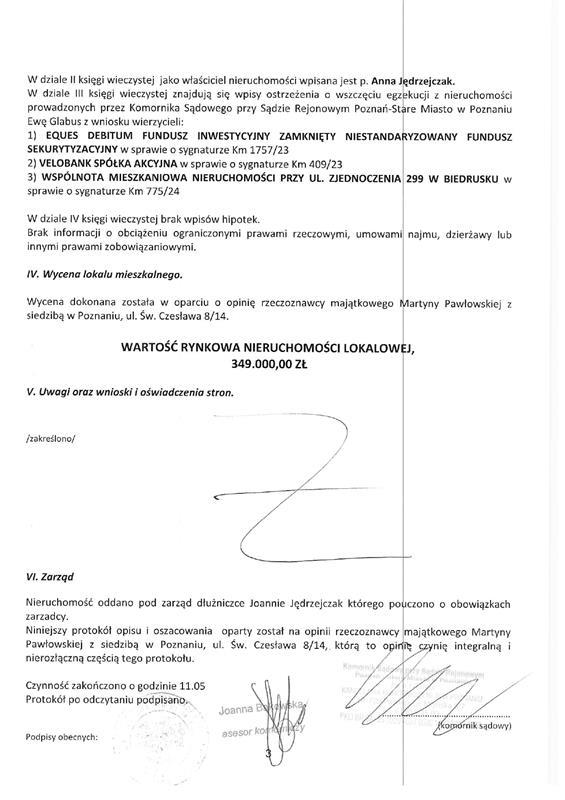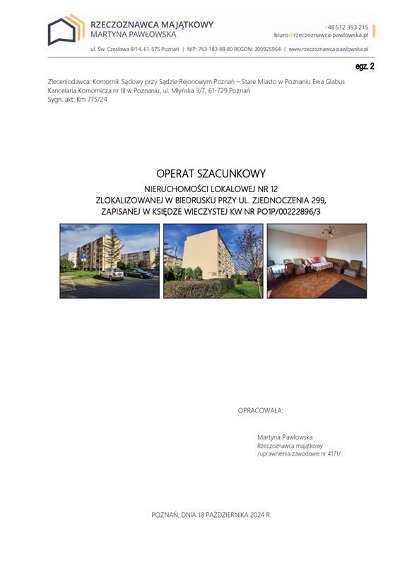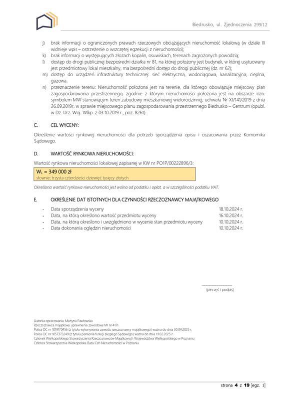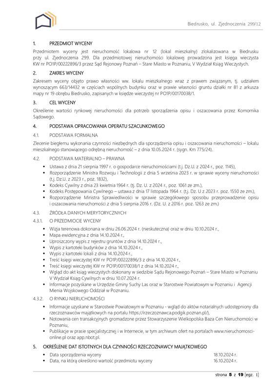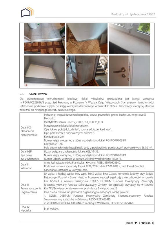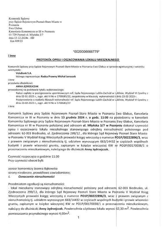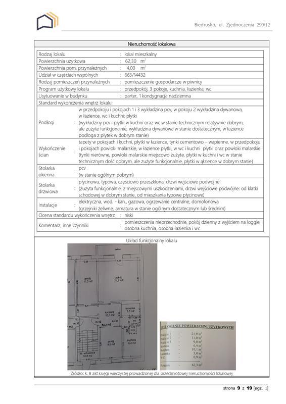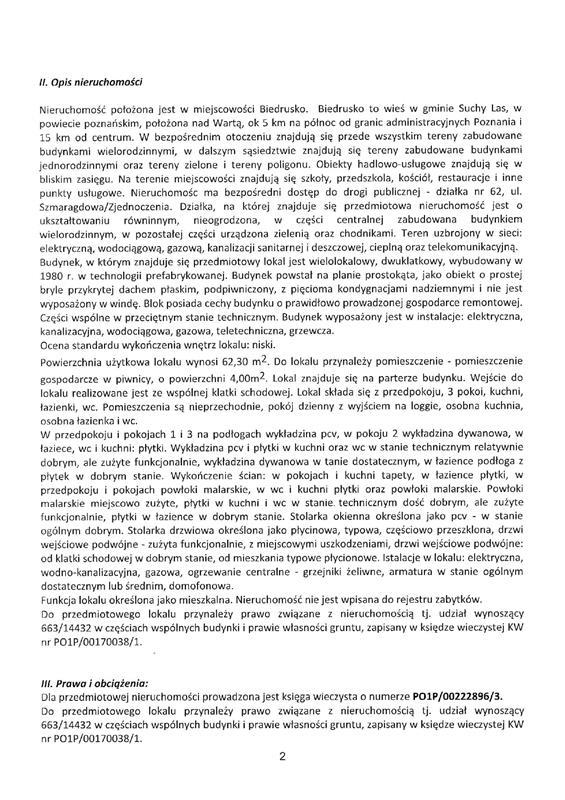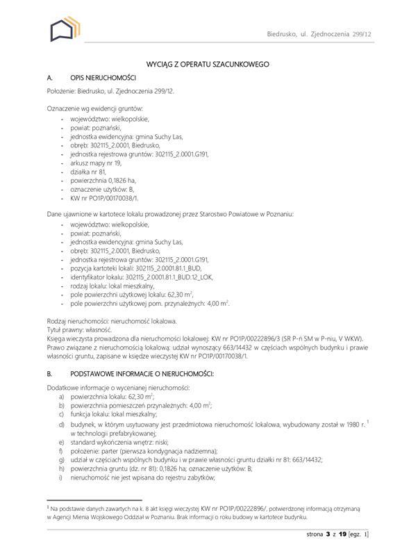 - lokal mieszkalny stanowiący odrębną nieruchomość położony pod adresem: 62-003 Biedrusko, ul. Zjednoczenia 299/12, dla którego Sąd Rejonowy Poznań Stare Miasto w Poznaniu V Wydział Ksiąg Wieczystych prowadzi księgę wieczystą o numerze PO1P/00222896/3, wraz z prawem związanym z nieruchomością tj. udziałem wynoszącym 663/14432 w częściach wspólnych budynki i prawie własności gruntu, zapisanym w księdze wieczystej KW nr PO1P/00170038/1 o przeznaczeniu mieszkaniowym, należący do dłużniczki Anny Jędrzejczak. Powierzchnia użytkowa lokalu wynosi 62,30 m2. Powierzchnia pomieszczenia przynależnego wynosi 4,00m2.