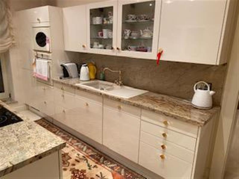 Kuchnia w zabudowie z meblami drewnianymi z frontami w pełnym połysku. Wyspa kuchenna. Blaty marmurowe. Zabudowa wraz z szafami garderobowymi traktowana jako część składowa nieruchomości. Okna dachowe dobrej jakości firmy Velux.