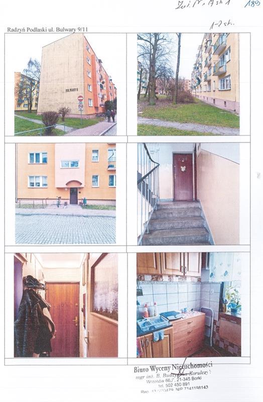 Opis nieruchomości: udział 1/6 w spółdzielczym własnościowym prawie do lokalu mieszkalnego położonego w msc. Radzyń Podlaski, ul. Bulwary 9/11, wpisanego w rejestrze lokali własnościowych Radzyńskiej Spółdzielni Mieszkaniowej, dla którego Sąd Rejonowy Wydział Ksiąg Wieczystych w Radzyniu Podlaskim prowadzi księgę wieczystą o numerze NKW LU1R/00093750/6. Charakterystyka ogólna lokalu. Lokal nr 11 usytuowany jest na III piętrze budynku wielolokalowego. Lokal składa się z 2 pokoi w tym jeden przechodni, kuchni, przedpokoju, łazienki z w-c . Lokal posiada balkon od strony wschodniej. Układ przestrzenno-funkcjonalny lokalu mało korzystny. Orientacja lokalu względem stron świata średnia, nasłonecznienie średnie. Do lokalu przynależy piwnica o powierzchni 2,70m2. Powierzchnia użytkowa lokalu 35,10 m.kw. Suma oszacowania udziału wynosi 30.949,00 zł, zaś cena wywołania jest równa 2/3 sumy oszacowania i wynosi 20.632,67 zł. W ciągu dwóch tygodni przed licytacją wolno oglądać wyżej wymienioną nieruchomość w dni powszednie od godz. 12:00 do godz. 16:00. W systemie teleinformatycznym udostępnia się natomiast protokół opisu i oszacowania.