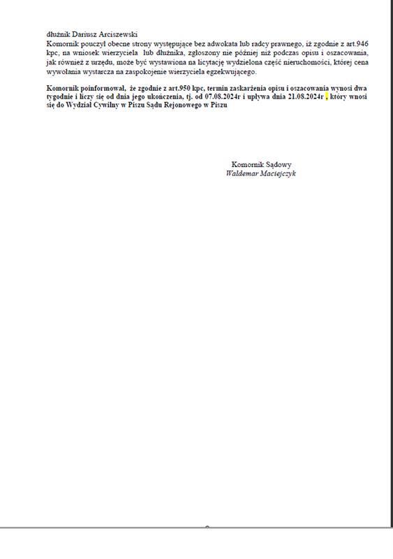 Komornik Sądowy Przy Sądzie Rejonowym w Piszu Kancelaria Komornicza w Piszu podaje do publicznej wiadomości, że w sprawie Km 37/22 w dniu: 16.01.2026 o godzinie: 11:00 rozpocznie się w trybie ustalonym w art. 9864 § 4 ustawy z dnia 17 listopada 1964 r. Kodeks postępowania cywilnego (dalej: kpc) druga licytacja w trybie elektronicznym następujących nieruchomości:
