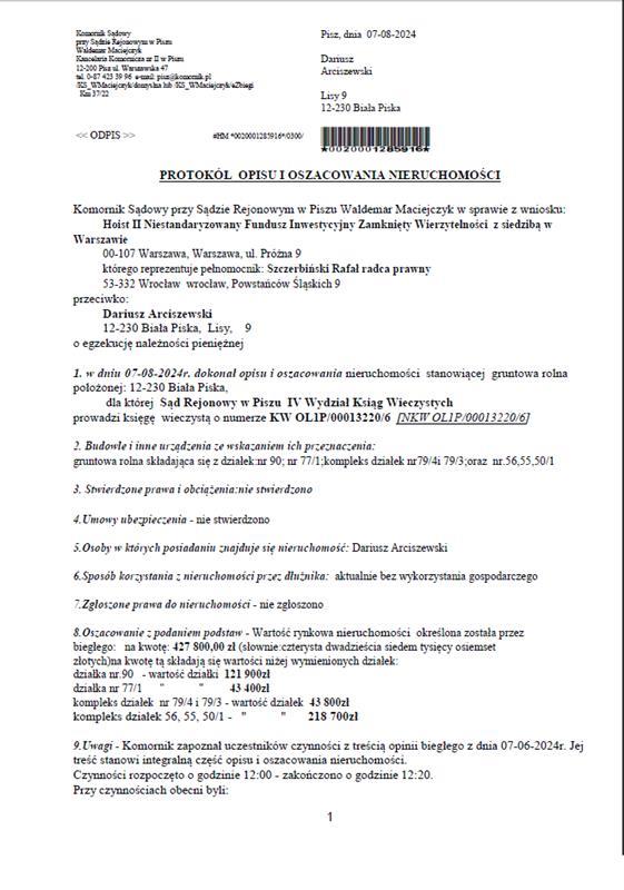 - nieruchomości położonej przy 0 0/0, 12-230 Biała Piska, dla której Sąd Rejonowy w Piszu IV Wydział Ksiąg Wieczystych (adres: ul. Warszawska 47, Pisz, 12-200 Pisz) prowadzi księgę wieczystą o numerze OL1P/00013220/6.