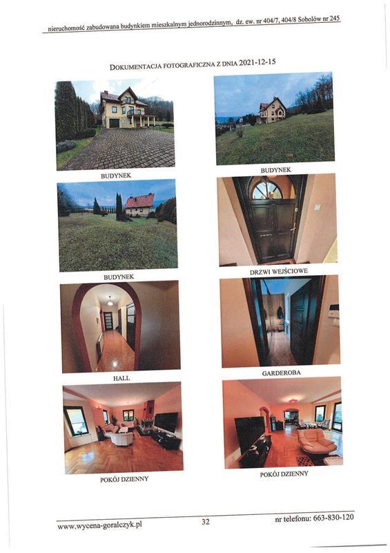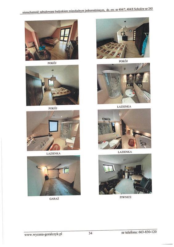 Działki ewidencyjne nr 404/7 i 404/8 o łącznej powierzchni 2000 m2 przylegają do siebie tworząc całość gospodarczą. W południowej części działki ewidencyjnej nr 404/7 znajduje się dom mieszkalny jednorodzinny. Pozostały obszar stanowi ogród przydomowy, ogrodzony, zagospodarowany zielenią, zadbany, przystrzyżony trawnik, liczne nasadzenia drzew i krzewów ozdobnych, w północno-wschodniej części działki nr 404/8 posadowiona altana ogrodowa oraz grill kamienny, dojazd, dojście do budynku, opaska wokół budynku oraz ścieżka prowadząca do altany utwardzone kostką betonową. Teren ogrodzony, brama wjazdowa z napędem. Teren o dość dużym nachyleniu, kształt działek regularny prostokątny. Do działki doprowadzone: woda, gaz, sieć elektroenergetyczna oraz telekomunikacyjna, na działce zbiornik szczelny na nieczystości ciekłe.