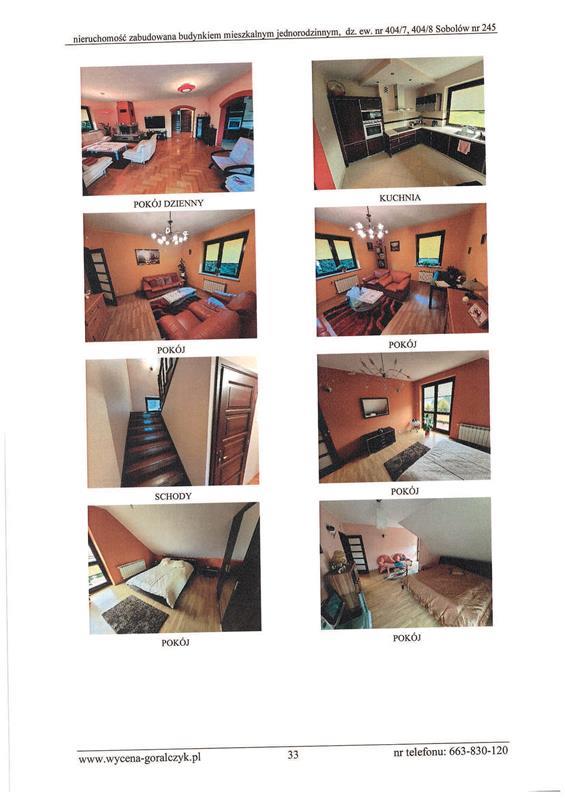 Nieruchomość obciążona jest nieodpłatną dożywotnią służebnością osobistą polegającą na prawie zamieszkiwania w całym domu mieszkalnym nr 245 położonym w miejscowości Sobolów na nieruchomości składającej się z działek nr 404/7 o powierzchni 0,10 ha i 404/8 o powierzchni 0,10 ha, której wartość wynosi 387.000,00 zł i podlegać będzie zaliczeniu na cenę nabycia w rozumieniu art. 1000§3 KPC co oznacza, że w przypadku pozostawania w mocy tej służebności nabywca odzyska część ceny odpowiadającą wartości obciążenia służebnością (387.000,00 zł).