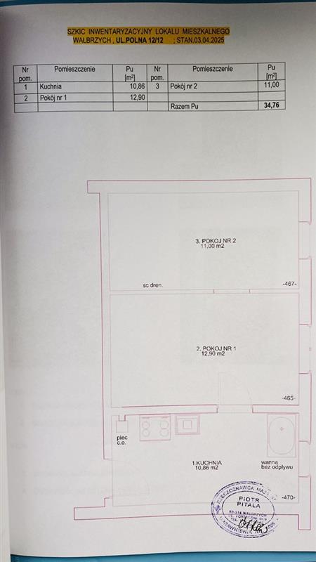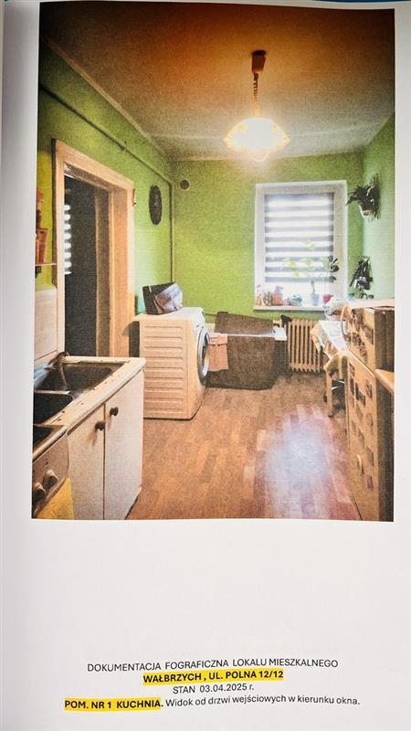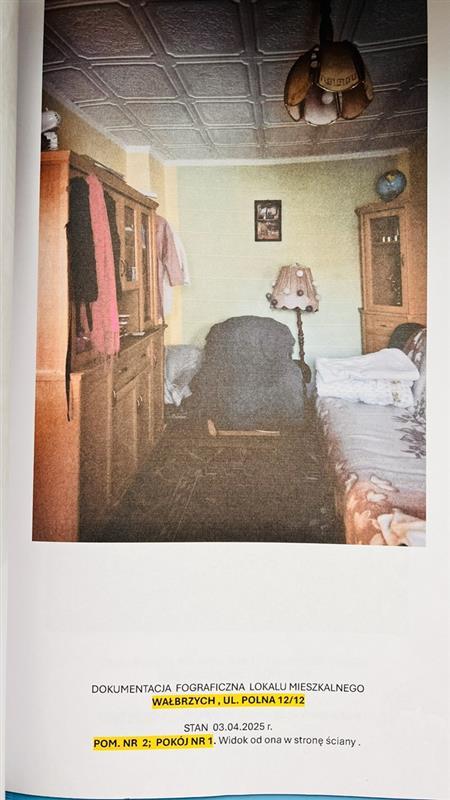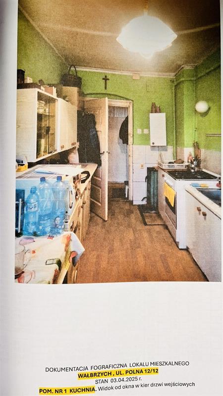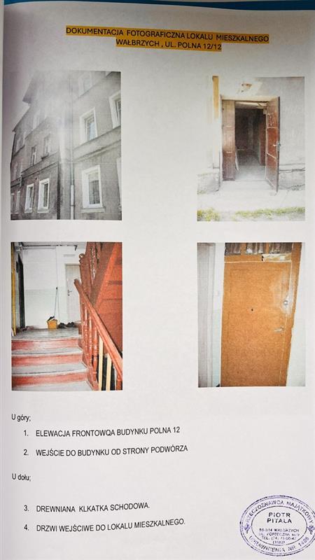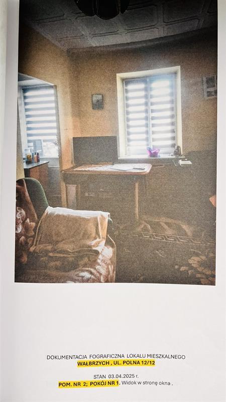 Nieruchomość lokalowa według księgi wieczystej składa się z 2 pokoi i 1 kuchni i stan ten jest zgodny ze stanem faktycznym na dzień 03.04.2025 r. Lokal nie spełnia wymogów standardowych lokalu mieszkalnego i posiada istotną wadę – brak WC, toalety i korytarza. Powierzchnia użytkowa lokalu mieszkalnego wynosi 34,76 m2. Lokal stanowi odrębną nieruchomość. Standard lokalu niski. Układ funkcjonalny nieprawidłowy – pomieszczenia przechodnie. Według oświadczenia aktualnego użytkownika, do lokalu przynależą piwnica i komórka na węgiel na zewnątrz oraz szopa (nie ujawnione w KW). Brak balkonu. Lokal położony na 3 kondygnacji domu mieszkalnego wielorodzinnego, w zabudowie luźnej. Budynek 3 kondygnacyjny z poddaszem użytkowym, podpiwniczony, wykonany w technologii tradycyjnej (murowany). Położenie budynku – na działce gruntowej nr 554/3 o pow. 909 m2 , bezpośrednio przy ul. Polnej. Lokal wyposażony w energię elektryczną, gaz sieciowy, wodę i kanalizację. Brak w lokalu ciepłej wody. Ogrzewanie etażowe, piec CO usytuowany w kuchni. W budynku brak windy osobowej. Wejście do budynku od podwórza. Udział związany z własnością lokalu w nieruchomości KW SW1W/00048872/0 wynosi 563/10000. Ulica Polna objęta została planem rewitalizacji, zaś sama nieruchomość budynkowa nie. Nieruchomość nie podlega ochronie konserwatorskiej. Budynek nr 12 położony w obszarze rewitalizacji miasta. Budynek nie posiada świadectwa charakterystyki energetycznej. Lokalizacja nieruchomości: 58-301 Wałbrzych (Obr. Nowe miasto nr 26), ul. Polna 12/12, powiat m. Wałbrzych, woj. dolnośląskie.