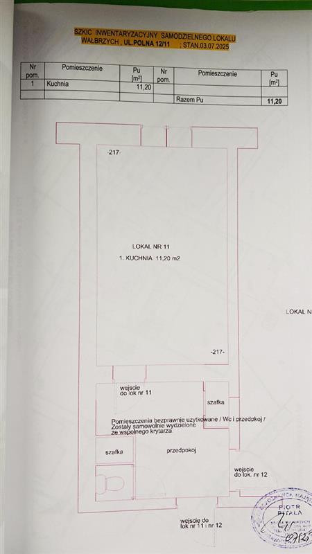 Uwaga! Właściciel lokali nr 11 i nr 12 bezprawnie zajął część wspólnej powierzchni korytarza i ją zabudował z przeznaczeniem na przedpokój i WC. Wykonane bezprawnie pomieszczenia służą obydwu lokalom, tj. nr 11 i nr 12. Wejścia do lokalu nr 11 i nr 12 z przedpokoju, a do przedpokoju ze wspólnego korytarza. Właściciel lokalu nr 11 użytkuje jednocześnie lokal nr 12. Lokal nr 12 stanowi odrębną samodzielną nieruchomość, dla której jest prowadzona księga wieczysta o nr SW1W/00071580/6. Właścicielem lokalu nr 12 jest ta sama osoba, która posiada prawo własności do lokalu nr 11. W ocenie biegłego ze względu na specyficzną sytuację korzystania z pomieszczeń przedpokoju i WC, obydwie nieruchomości, tj. lokal nr 11 i nr 12 powinny stanowić własność tej samej osoby.