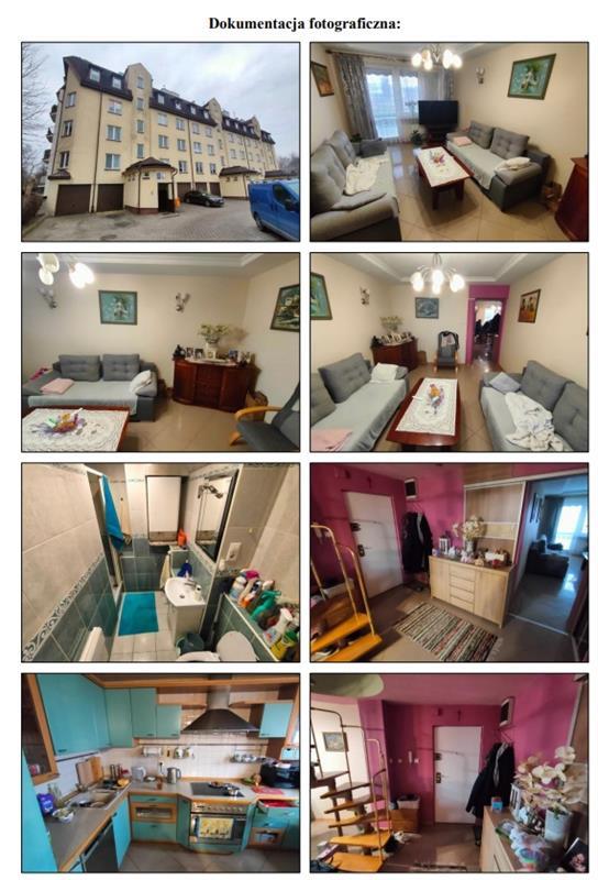 Mieszkanie stanowiące własność dłużników Danuta Sierocka udział 1/2 oraz Roman Sierocki udział 1/2. Egzekucja z ww. udziałów została połączona w trybie art. 926 kpc. Lokal mieszkalny nr 12 zlokalizowany przy ul. Czeremchowej 20 w Lublinie znajduje się w budynku mieszkalnym wielorodzinnym wzniesionym w 1999 roku. Lokal jest dwupoziomowy i usytuowany na trzecim piętrze oraz poddaszu budynku. Powierzchnia użytkowa lokalu wynosi 100,20 m², natomiast powierzchnia przynależnej piwnicy to 9,60 m². Lokal posiada funkcjonalny układ pomieszczeń, zapewniający komfort użytkowania dla rodziny wieloosobowej. Na poziomie dolnym (trzecie piętro) zlokalizowana jest kuchnia wraz z aneksem jadalnym, przestronny salon z wyjściem na balkon, łazienka z WC oraz korytarz stanowiący główną komunikację wewnętrzną. Wykończenie pomieszczeń wykonane w standardzie dobrym, na podłogach płytki ceramiczne, ściany malowane – ostatnie odświeżenie w postaci malowania przeprowadzono około 2020 roku. Na tym poziomie zastosowano ogrzewanie podłogowe, zapewniające równomierną dystrybucję ciepła. Na górnym poziomie (poddasze) znajdują się trzy niezależne pokoje, korytarz, łazienka z WC oraz pralnia. Pomieszczenia doświetlone są poprzez okna połaciowe. Na poddaszu stwierdzono jednak widoczne uszkodzenia spowodowane nieszczelnością pokrycia dachowego – występują miejscowe zagrzybienia, odspojenia farby oraz łuszczenie się powłok malarskich na powierzchniach sufitu i ścian. Usterki te wskazują na zawilgocenie i nieszczelność izolacji dachowej, co może wymagać dalszej diagnostyki technicznej oraz interwencji remontowej. W łazience na poddaszu również zamontowano ogrzewanie podłogowe. Lokal wyposażony jest w pełną instalację techniczną, obejmującą instalację elektryczną, wodociągową, kanalizacyjną, gazową oraz centralnego ogrzewania. Źródłem ciepła dla instalacji C.O. oraz podgrzewu ciepłej wody użytkowej jest indywidualny dwufunkcyjny piec gazowy zlokalizowany w łazience. 14 Stolarka okienna w lokalu to okna PCV oraz drewniane połaciowe (w części poddaszowej). Stan techniczny lokalu, z wyjątkiem uszkodzeń wynikających z przecieków dachowych, oceniany jest jako dobry. Lokal nadaje się do dalszego użytkowania, przy czym konieczne jest wykonanie prac remontowych w obrębie poddasza, mających na celu usunięcie skutków zawilgoceń oraz przywrócenie estetyki i bezpieczeństwa użytkowania.