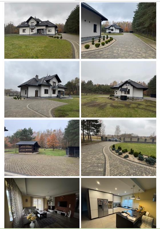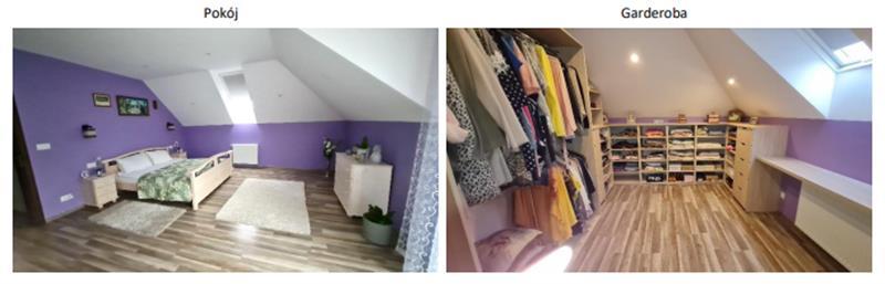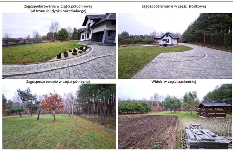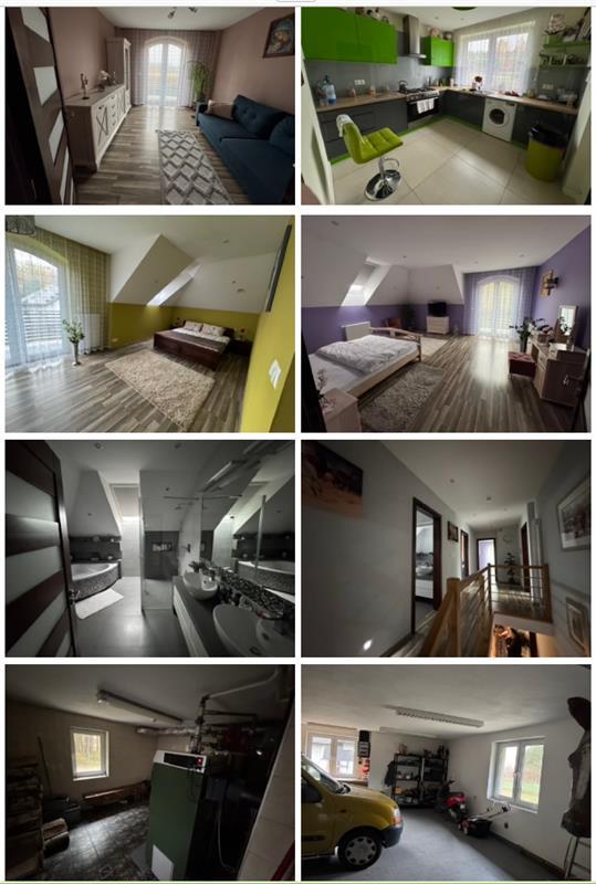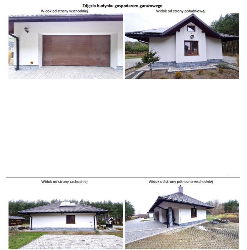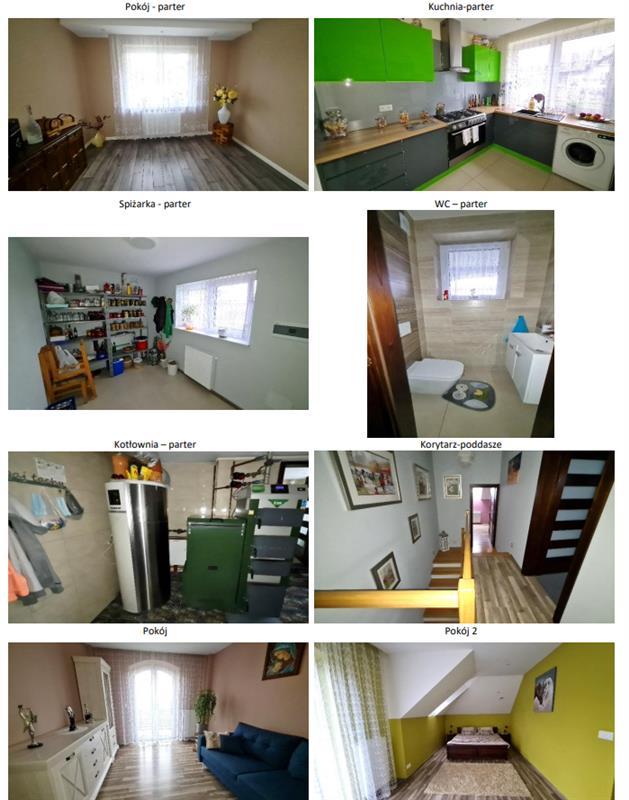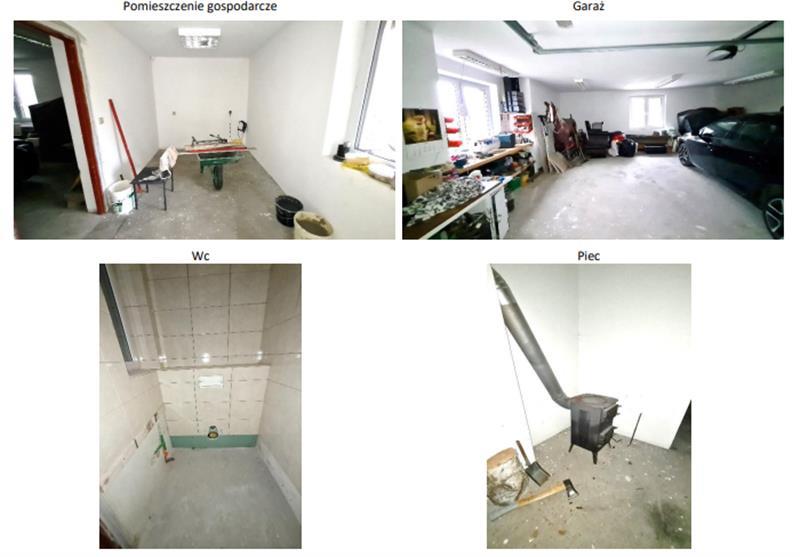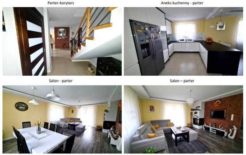 Dane na temat konstrukcji budynku mieszkalnego: • dom posadowiony na fundamencie betonowym, • ściany zewnętrzne wykonane w technologii tradycyjnej murowanej, budynek docieplony styropianem pokryty klejem na siatce podtynkowej z tynkiem elewacyjnym cienkowarstwowym, • ściany wewnętrzne nośne i działowe murowane, • strop żelbetowe, schody wewnętrzne żelbetowe, • dach wielospadowy; więźba dachowa drewniana, pokrycie dachówka ceramiczna, • kominy murowane, • stolarka okienna PVC - trójszybowa, rolety antywłamaniowe, drzwiowa płycinowa, brama garażowa panelowa, • tynki wewnętrzne tradycyjne z gładzią gipsową malowane farbami, podłogi wykończone różnymi materiałami (płytki ceramiczne, panele drewnopochodne), aneks kuchenny ze stałą zabudową meblową, podobnie jak dodatkowa kuchnia ze stałą zabudową wraz z wbudowanymi sprzętami AGD, w salonie znajduje się kominek do celów rekreacyjnych z rozprowadzeniem grawitacyjnym ciepłego powietrza, łazienka i WC wykończone całościowo płytkami ceramicznymi, • budynek wyposażony w instalacje: elektryczną, wodną i kanalizacyjną podpiętą do sieci gminnej, gazu ziemnego zasilanego z butli, wentylacji, instalację centralnego ogrzewania zasilanej z pieca na paliwo stałe (ekogroszek), w tym podłogowego w pomieszczeniach, w których na posadzce znajdują się płytki ceramiczne.