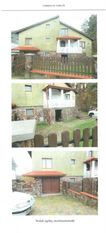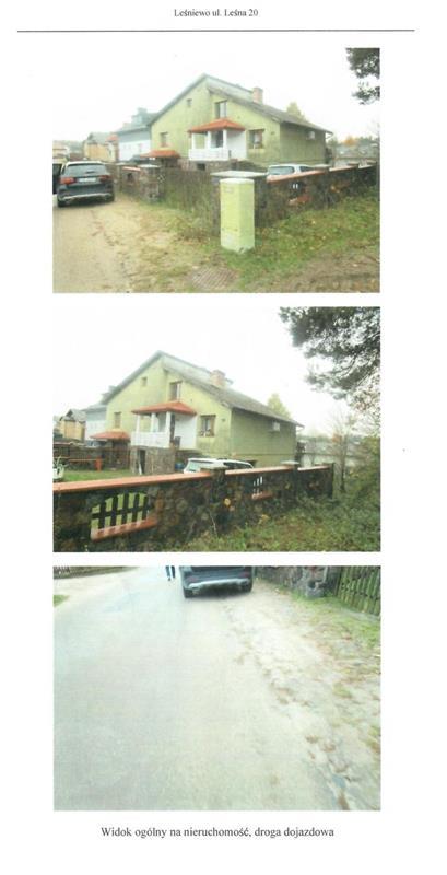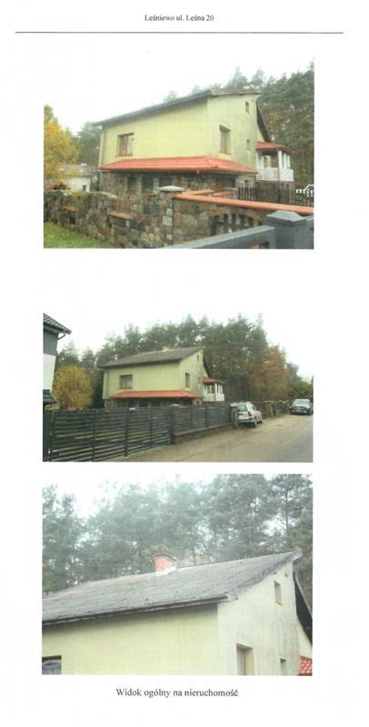 Przedmiotowa nieruchomość położona jest przy ulicy Leśnej 20 w Leśniewie (województwo pomorskie, powiat pucki). Nieruchomość znajduje się w części południowej miejscowości. W najbliższym otoczeniu nieruchomości usytuowane są nieruchomości zabudowane domami mieszkalnymi, las, dalej też działki niezabudowane.Dojazd do nieruchomości drogą asfaltową, gminną – ulicą Leśną. W skład nieruchomości wchodzi działka gruntu o powierzchni 918 m2 zabudowana podpiwniczonym, parterowym z użytkowym poddaszem budynkiem mieszkalnym o powierzchni użytkowej 187,31 m2. Jest to budynek wolnostojący. Działka ma regularny kształt. Teren z nieznacznym spadkiem w kierunku południowym. Działka ogrodzona - od frontu ogrodzenie murowane z kamienia z wypełnieniem i bramą wjazdową z drewna; w części płotem z siatki na słupkach. Budynek został zaprojektowany w technologii tradycyjnej (opis z projektu): ściany zewnętrzne garaż - bloczki gazobetonowe; ściany zewnętrzne poddasze - bloczki gazobetonowe + styropian; ścianki działowe - z cegły pełnej lub dziurawki; stropy DZ-3, strop nad garażem płyta betonowa zbrojona; schody zewnętrzne żelbetowe. Dach docieplony wełną mineralną. Pokrycie dachu stanowi eternit! - tj. materiał azbestowo-cementowy zakazany obecnie do stosowania z uwagi na stwierdzoną szkodliwość włókien azbestu. Materiał taki winien być zdemontowany przez specjalistyczną firmę. Drewniane elementy przy dachu zniszczone. Okna są pcv i drewniane. W dobudowanym z tyłu budynku garażu brak okien i bramy wjazdowej. Brama wjazdowa w garażu w podpiwniczeniu dwuskrzydłowa. Cokół budynku od zewnątrz obłożony kamieniem. Budynek, zgodnie z projektem, wyposażony jest w instalacje: elektryczną, wodno-kanalizacyjną (szambo), grzewczą (prawdopodobnie piec na paliwo stałe- węgiel). Z mapy zasadniczej wynika, iż nieruchomość wyposażona jest w sieci energetyczną, wodociągową. Sieć gazowa i telefoniczna jest w ulicy. Przez działkę wzdłuż jej granicy z dz. 164/2 przebiega sieć energetyczną do sąsiedniej nieruchomości (dz. 506) Parametry budynku – zgodnie z projektem budowlanym: powierzchnia zabudowy:208,45 m2, powierzchnia użytkowa: 187,31 m2 dodatkowo piwnica o powierzchni:136,40 m2 Zgodnie z projektem na poziomie piwnicy znajduje się kotłownia, garaże oraz pomieszczenia gospodarcze. Na parterze, zgodnie z projektem, zlokalizowane są pokoje, garderoba, łazienka, kuchnia, spiżarnia. Na poddaszu, zgodnie z projektem, zaplanowane zostały sypialnia, pokój dzienny, garderoba, łazienka, pomieszczenie gospodarcze. Budynek nie jest obiektem nowym - pozwolenie na budowę wydane w 1982 r., w roku 1993 budynek w części oddany do użytkowania. Stan budynku z zewnątrz nie wskazuje na dokonywanie w nim remontów, dodatkowo dach ma stare pokrycie z eternitu. Na dachu część poszycia porasta mech. Miejscami spoiny w kominie z ubytkami. Tynki zewnętrzne budynku brudne.