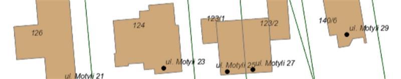 Działka ta jest ogrodzona razem z działką sąsiednią nr 123/2 zabudowaną nieruchomością w postaci domu położonego przy ul. Motyli 27 w Katowicach. Przy czym jak wynika z mapy zasadniczej ogrodzenie to nie pokrywa się w całości z przebiegiem granicy działki. Na działce od strony zachodniej znajduje się fragment budynku niemieszkalnego prawie w całości posadowionego na działce sąsiedniej nr 123/2 będącego przedmiotem e-licytacji nieruchomości zaplanowanej na dzień 19 marca 2026 r. o godz. 11:00 .