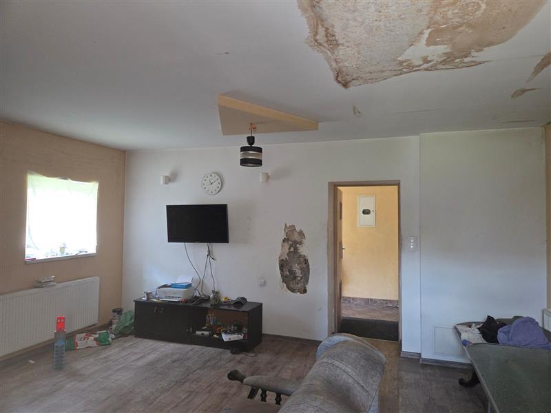 Ściany – parter: na ścianach zmontowano płyty g-k, następnie położono gładź gipsową i pomalowano farbą (w niektórych miejscach widoczne bardzo niestaranne położenie gładzi). W korytarzu fragment ściany obłożono płytkami imitującymi kamień w kolorze szarym oraz w niektórych pokojach w kolorze białym. W kuchni ściany dodatkowo obłożone płytkami ceramicznymi. W łazience ściany na całej wysokości obłożone płytkami ceramicznymi. Przede wszystkim w pokojach na ścianach widoczne są mocne ślady pleśni i zawilgocenia. Poddasze możliwe jest do adaptacji na użytkowe, jednak na chwile obecną stanowi część nieużytkową w większości w stanie surowym. W piwnicy ściany w większości otynkowane, widoczne bardzo mocne ślady pleśni oraz zawilgocenia.