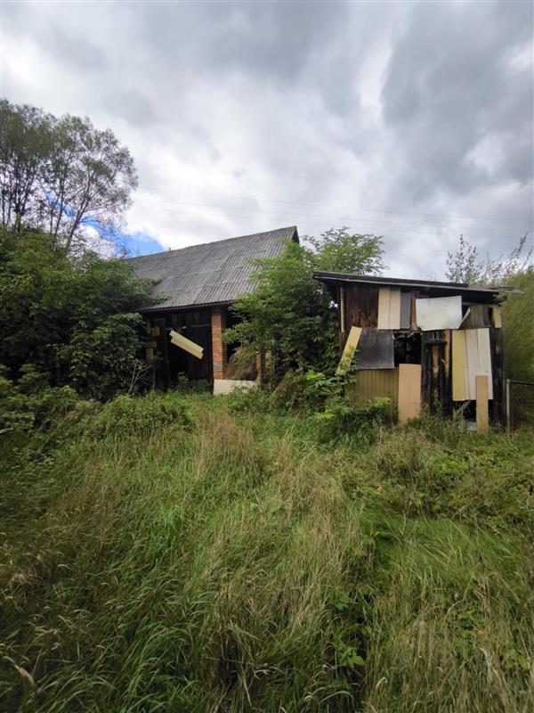 Układ funkcjonalny budynku: na parterze mieści się wiatrołap wraz klatką schodową na poddasze nieużytkowe, dwa niewielkie korytarze, mała łazienka, kuchnia, pokój od strony południowo- wschodniej (część stara budynku) oraz od strony zachodnio – północnej dwa pokoje przechodnie. Budynek zaniedbany, brak jakichkolwiek remontów, brak izolacji przeciwwilgociowych, pozostawiony bez dozoru przez ostatnie lata, od strony skarpy – wybite okno, instalacja grzewcza zdemontowana i rozkradziona. Dodatkowo na przedmiotowej działce posadowione są zabudowania gospodarskie drewniano – murowane (obora murowana pustaka leszowego, stodoła i boisko w konstrukcji drewnianej ryglowej z pojedynczym deskowaniem), pod jednym dachem (o pokryciu płytami azbestowymi), o łącznej powierzchni użytkowej = 79,26m², Stan techniczny zabudowań gospodarskich - pogorszony.