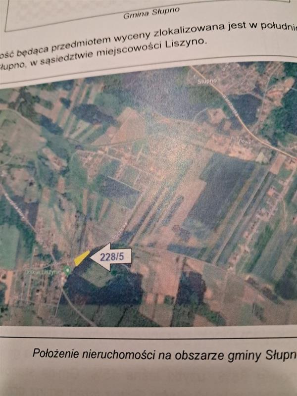 Nieruchomość zlokalizowana w południowo-zachodniej części obrębu Słupno, w sąsiedztwie miejscowości Liszyno. Otoczenie działki 228/5 stanowią od strony północno-zachodniej - ulica Pocztowa i dalej tereny rolne z pojedynczą zabudową zagrodową, od strony południowo-wschodniej - las, od strony południowo-zachodniej - grunty użytkowane rolniczo i dalej zabudowa mieszkaniowa jednorodzinna i zagrodowa wsi Liszyno. Działka nr 228/5 o pow. 0,5471 ha posiada dostęp do drogi publicznej o nawierzchni asfaltowej - ul. Pocztowej, przy której biegnie sieć wodociągowa, teletechniczna i kanalizacyjna sanitarna. Linia energetyczna niskiego napięcia zlokalizowana jest poza pasem drogowym, po drugiej stronie ulicy. Działka nr 228/5 ma kształt trójkąta, stanowi grunt niezabudowany, użytkowany rolniczo.