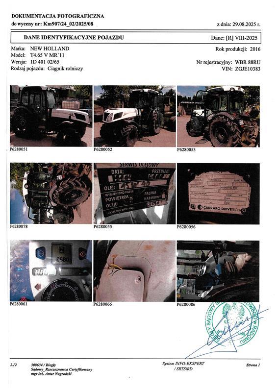 | 1 | Rodzaj: CIĄGNIK ROLNICZY (operat biegłego do wglądu w kancelarii) Marka: NEW HOLLAND Model: T4.65V MR11 Rok produkcji: 2016 Rejestracja: WBR88RU Silnik: poj: 3200 cm3, moc: 48 KM, rodz. paliwa: OLEJ NAPĘDOWY VIN: ZGJE10383 Data pierwsz. rejestracji: 2017-08-25 Brak informacji o ważnym badaniu technicznym | 1 | 107 300,00 zł 87235,77 zł netto + 23% VAT | 80 475,00 zł* | 805,00 zł |