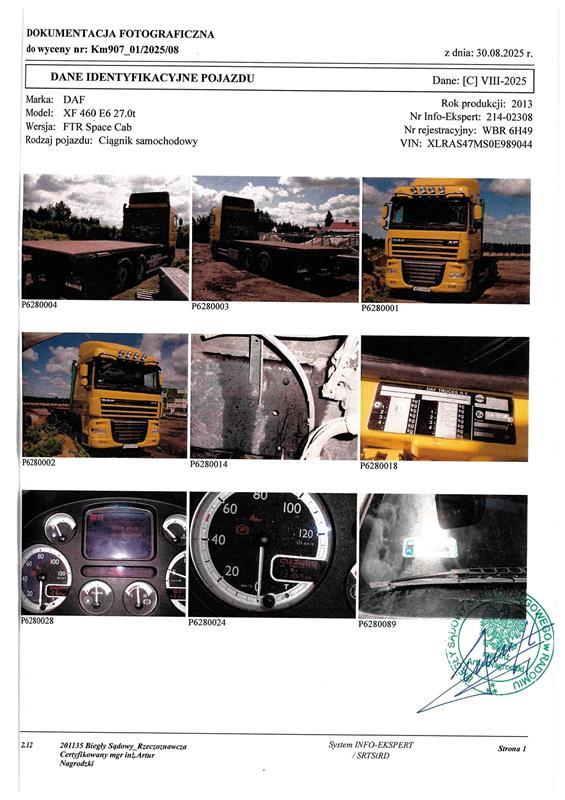 | 2 | Rodzaj: SAMOCHÓD SPECJALNY (operat biegłego do wglądu w kancelarii) Marka: DAF Model: XF 105.460 Rok produkcji: 2013 Rejestracja: WBR6H49 Silnik: poj: 12902 cm3, moc: 340 KM, rodz. paliwa: OLEJ NAPĘDOWY VIN: XLRAS47MS0E989044 Data ważności OC: 2026-08-31 Data pierwsz. rejestracji: 2013-09-02 | 1 | 80 442,00 zł 65400,00 zł netto + 23% VAT | 60 331,50 zł* | 3 017,00 zł |
