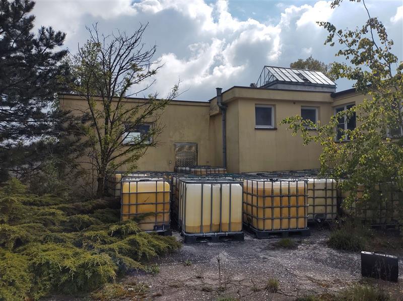 Na działce znajdują się zbiorniki typu Mauser wypełnione niezidentyfikowaną substancją płynną, która częściowo wyciekła na powierzchnię gruntu (widoczne nacieki na asfalcie oraz powierzchni trawiastej). Zbiorniki składowane