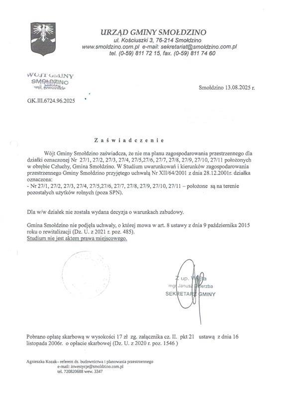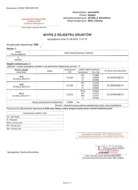 - nieruchomości, której właścicielem jest Nieruchomość gruntowa dz.nr 27/5 pow.0,3126 ha położonej przy .,Człuchy, 76-214 Smołdzino, dla której Nieruchomośc gruntowa (adres: ul. ., Człuchy, 76-214 Smołdzino) prowadzi księgę wieczystą o numerze SL1S/00072621/3.