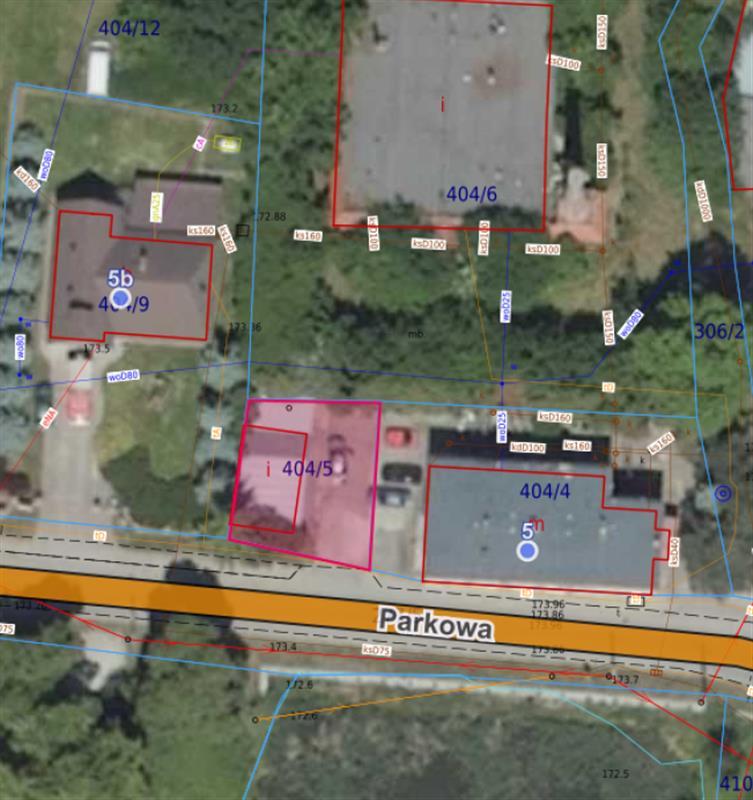 nr 404/5 AM-1( o pow. 0,011ha w klasie gruntu B), zabudowana drewnianym budynkiem garażowym , z dostępem do działki od ul. Parkowej i