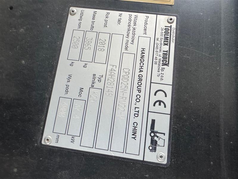 | 7 | Wózek jezdniowy podnośnikowy HANGHA CPQD25N-RW22-Y, prod. 2018 (z ważnymi badaniami UDT) | 1 | 49 100,00 zł 39918,70 zł netto + 23% VAT | 36 825,00 zł* | 1 842,00 zł |