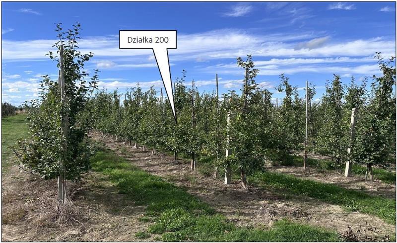 nieruchomość rolna: działka nr 200; (101306_2.0024.200) o powierzchni 1,6598 ha połozona w obrębie nr 24 Sadkowice. Przyłącze sieci elektroenergetycznej bezpośrednio na działce od strony wschodniej. Od strony wschodniej bezpośredni dostęp do drogi publicznej o nawierzchni gruntowej. Działka o nieregularnym kształcie zbliżonym do figury trapezu. Teren działki delikatnie pofalowany, z nasadzeniami drzew jabłoni w dwóch kwaterach o różnych fazach wzrostu. Do stabilizacji i prowadzenia drzewek zastosowano tyczki bambusowe oraz podpory ze słupów betonowych z linką stalową wspierające poszczególne rzędy. Ubytki w nasadzeniach na poziomie umiarkowanym. Na działce zlokalizowane są dwa słupy napowietrznej sieci elektroenergetycznej niskiego napięcia. Przeznaczenie terenu: R2- Obszary rolniczej przestrzeni produkcyjnej z dopuszczeniem zabudowy związanej z użytkowaniem rolniczym gruntów.