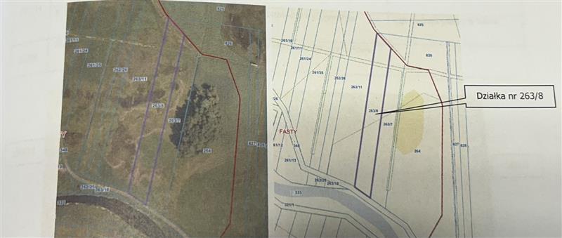 Nieruchomość stanowiąca nr działki 263/8 o pow. 0,3425 ha (użytek rolny ŁIII - 0,1523ha, ŁIV - 0,1827 ha, W-ŁIV- 0,0075 ha) położonej pod adresem: 16-002 Dobrzyniewo Duże, Fasty , dla której Sąd Rejonowy w Białymstoku IX Wydział Ksiąg Wieczystych prowadzi księgę wieczystą o numerze BI1B/00277480/8. Działka rolna niezabudowana położona na terenach zalewowych rzeki Białej, o kształcie regularnym, zbliżonym do prostokąta, brak ogrodzenia, działka posiada pośredni dostęp do drogi powiatowej nr 1392B poprzez drogi wewnętrzne gminy. W zasięgu działki brak infrastruktury technicznej i mediów. Brak miejscowego planu zagospodarowania przestrzennego. Zgodnie ze studium uwarunkowań i kierunków zagospodarowania przestrzennego gminy Dobrzyniewo Duże, zatwierdzone uchwała Nr XIX/148/20 Rady Gminy Dobrzyniewo Duże z dn. 28-02-2020 nieruchomość położona jest na obszarze szczególnego zagrożenia powodzią. Teren wyłączony spod zabudowy.