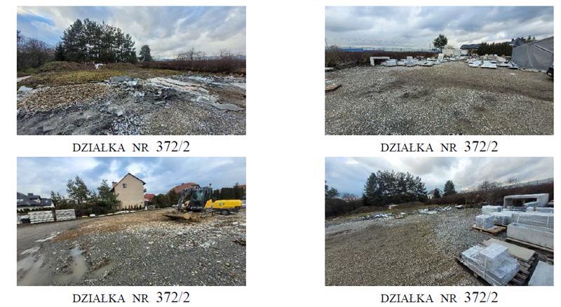 Działka nr 372/2 o powierzchni 2800 m2 ma kształt zbliżony do prostokąta dłuższym bokiem usytuowanego w kierunku północny – wschód/południowy – zachód. Nieruchomość częściowo ogrodzona siatką. Teren porośnięty zielenią niską, wysoką oraz fragmenty utwardzone. W południowo – zachodniej części zlokalizowany jest kojec dla psa, w południowo - centralnej części garaż blaszany oraz w północno – wschodniej części namiot magazynowy. Na fragmencie działki zamontowane panele fotowoltaiczne na stelażach. Teren nieruchomości zaśmiecony (m. in.: gruz, pustaki, drewno). Działka bez przyłączy.