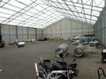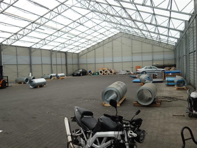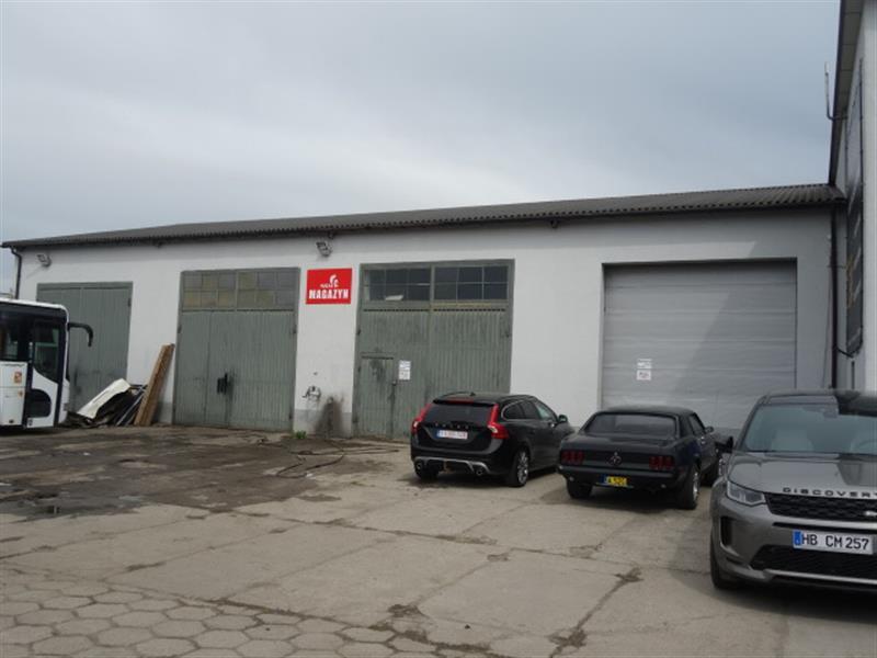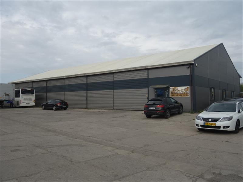 5) halą namiotową magazynową o konstrukcji stalowej, jednokondygnacyjna, ściany osłonowe wypełnione blacha warstwowa, częściowo płyta PUR, dach dwuspadowy kryty plandeką. Pow. zab. 800 m2 - hala nieujawniona w kartotece budynków.