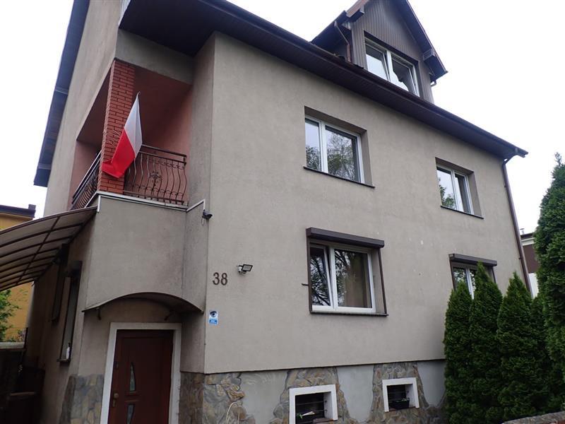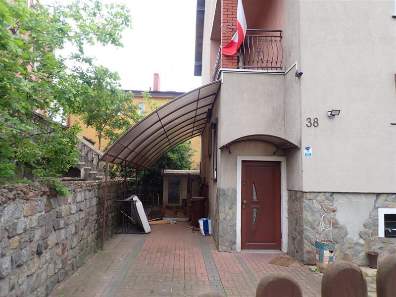 Budynek mieszkalny w zabudowie wolnostojącej, 1-piętrowy z poddaszem, podpiwniczony, z wbudowanym garażem. Budynek wybudowany w technologii tradycyjnej murowanej. Ściany zewnętrzne ocieplone, pokryte tynkiem strukturalnym i pomalowane, w części na poddaszu oblicowane sidingiem, ściany przyziemia częściowo oblicowane kamieniem naturalnym. Dach konstrukcji drewnianej, kryty gontem papowym (widoczne ubytki). Rynny i rury spustowe pcv. Drzwi zewnętrzne drewniane częściowo przeszklone. Wrota blaszane firmy „Wiśniowski”. Stolarka okienna pcv (w oknach na parterze zamontowane zewnętrzne rolety antywłamaniowe, natomiast w oknach piwnicznych zamontowane zewnętrzne kraty antywłamaniowe). Parapety zewnętrzne ceramiczne. Do budynku przylega wiata konstrukcji drewnianej, dach wiaty konstrukcji drewnianej kryty poliwęglanem. Do budynku przylega balkon. Powierzchnia zabudowy budynku wynosi 111m2. Kubatura budynku wynosi 823,74m3. Instalacje w budynku: elektroenergetyczna, wodno-kanalizacyjna, gazowa, c.o. indywidualna, ciepłej wody indywidualna, teletechniczna, wentylacji grawitacyjnej, wentylacji spalinowej.
